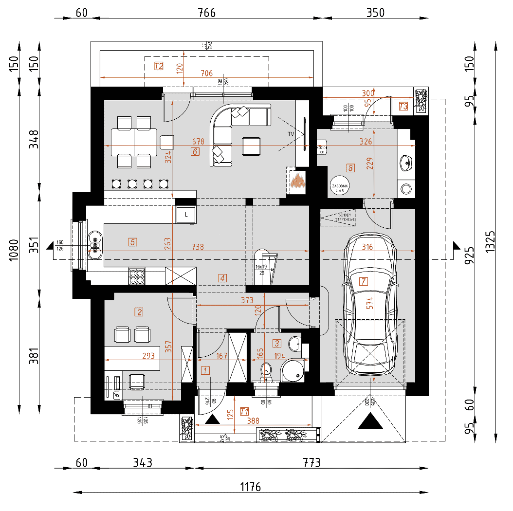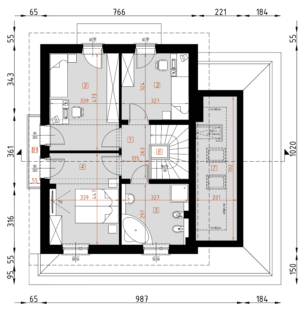 - rzuty wszystkich kondygnacji (np. parter, piwnica, piętro) – rozmieszczenie i wymiary wszystkich pomieszczeń, rozmieszczenie i wielkość otworów okiennych i drzwiowych, rozmieszczenie kominów, sugerowana aranżacja wnętrz.