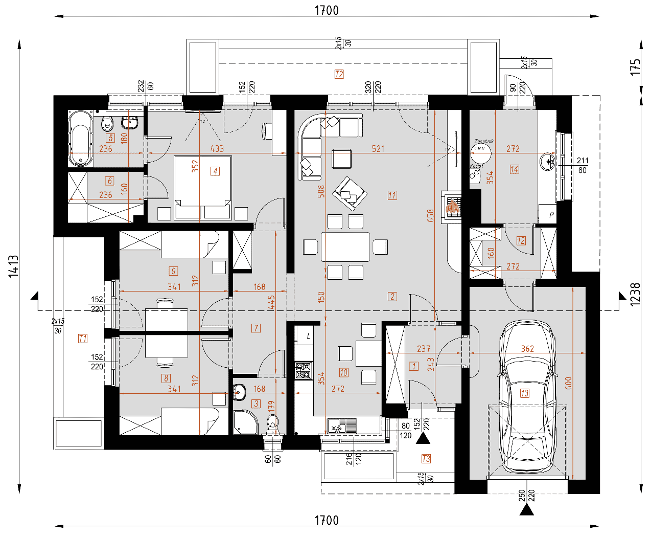 - rzuty wszystkich kondygnacji (np. parter, piwnica, piętro) – rozmieszczenie i wymiary wszystkich pomieszczeń, rozmieszczenie i wielkość otworów okiennych i drzwiowych, rozmieszczenie kominów, sugerowana aranżacja wnętrz.