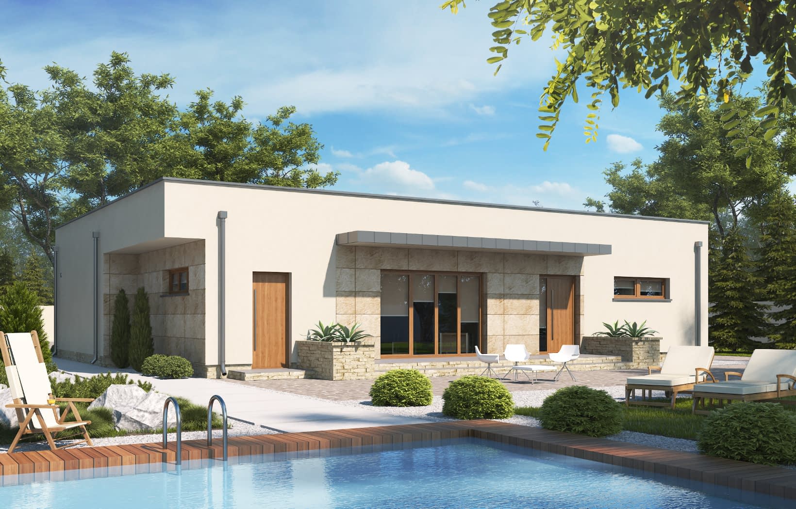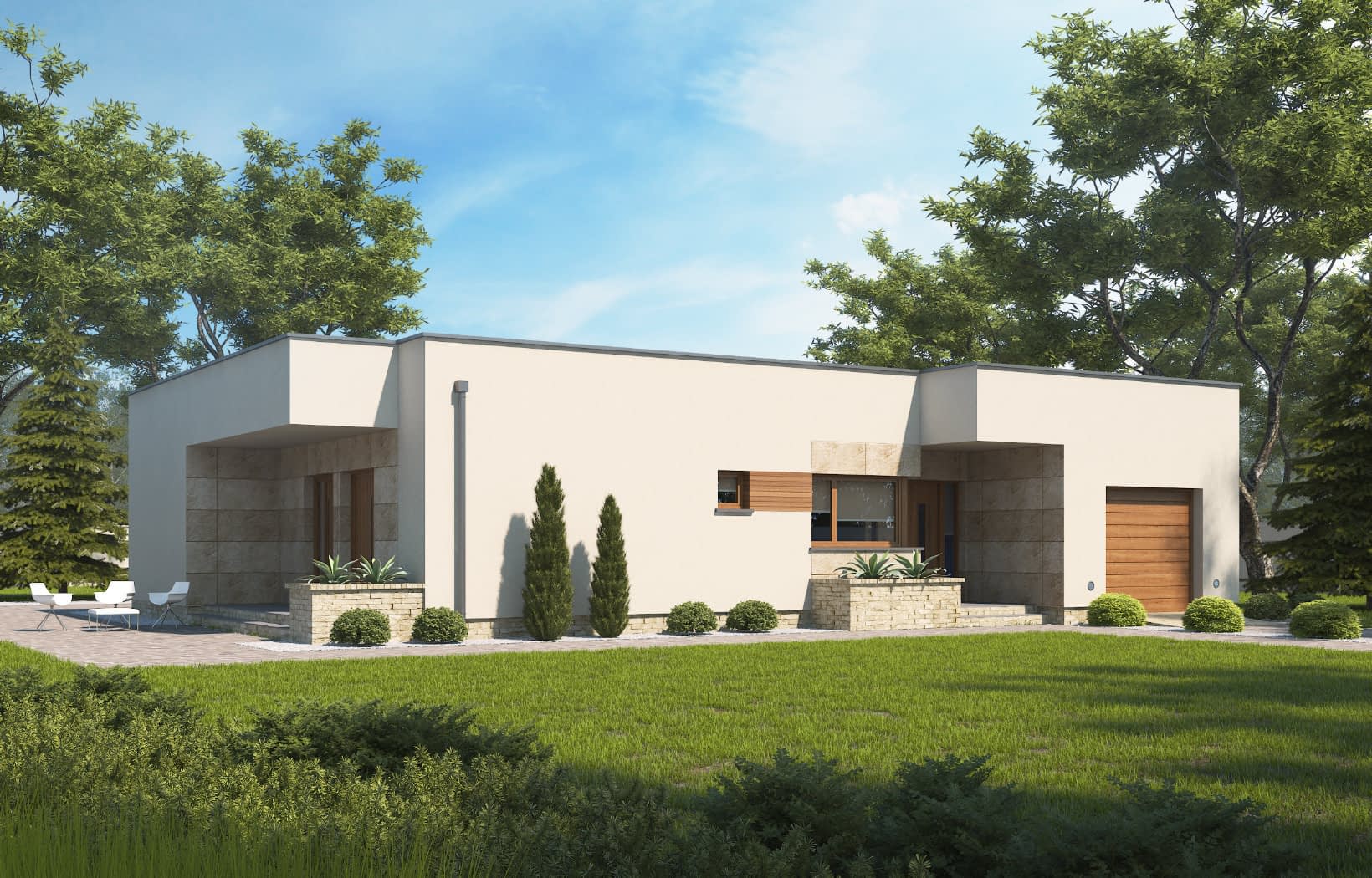 Projekt D135 jest funkcjonalnym domem parterowym z nowoczesną architekturą dedykowany 4 osobowej rodzinie. Strefa dzienna to duży, wygodny salon wraz z jadalnią i funkcjonalną, widną kuchnią. Strefa nocna została wyraźnie wydzielona i składają się na nią dwa pokoje z osobną łazienką oraz główna sypialnia z łazienką i garderobą. Garaż jednostanowiskowy wraz z kotłownią oraz spiżarnia to dodatkowe atuty tego domu.Konstrukcja