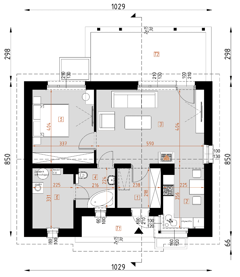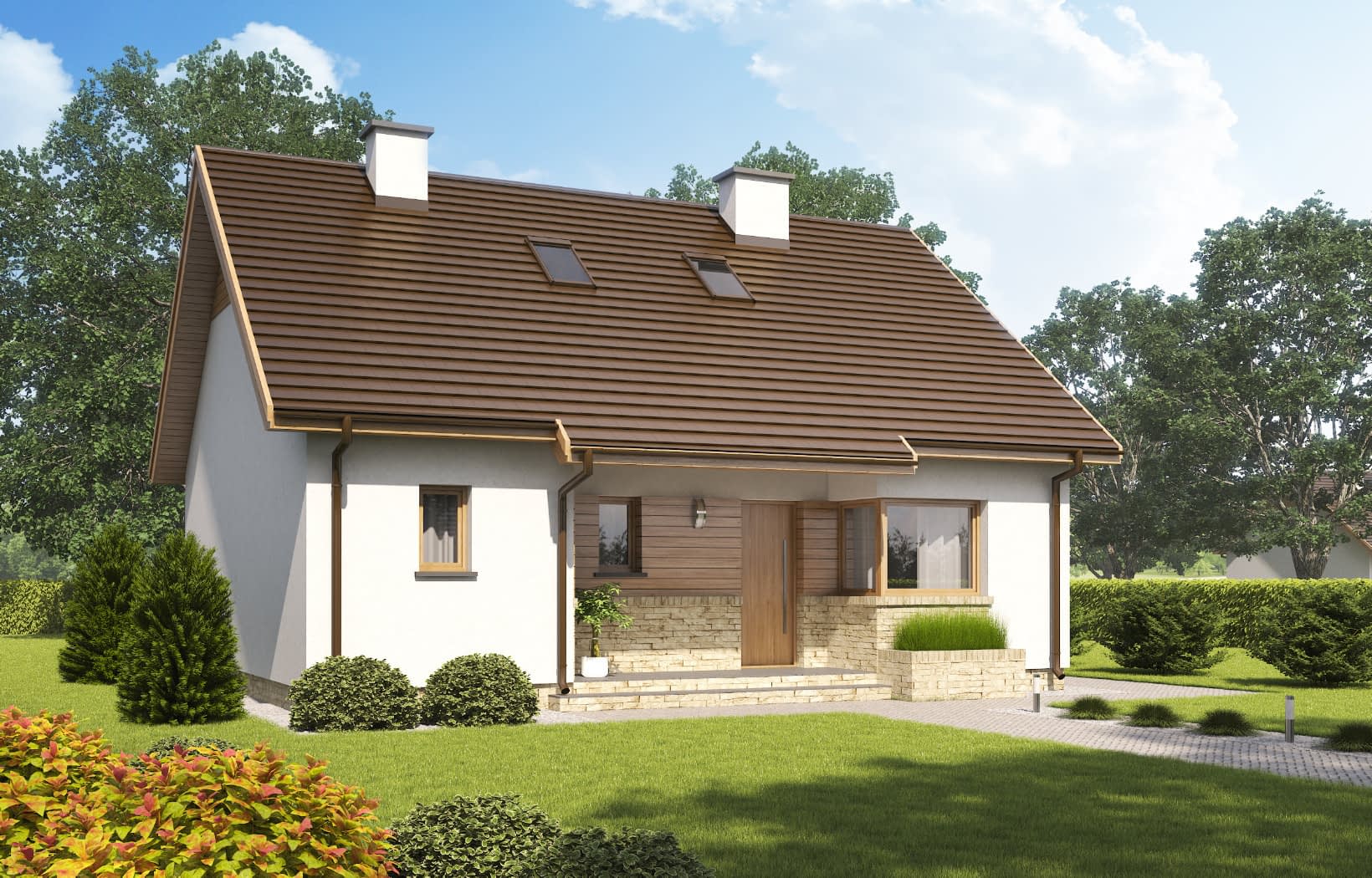 Nieduży parterowy dom zaprojektowany w technologii tradycyjnej z możliwością dobudowania garażu lub wiaty. Może też pełnić funkcję wygodnego domu letniego. Istnieje możliwość adaptacji strychu na cele mieszkalne.Konstrukcja