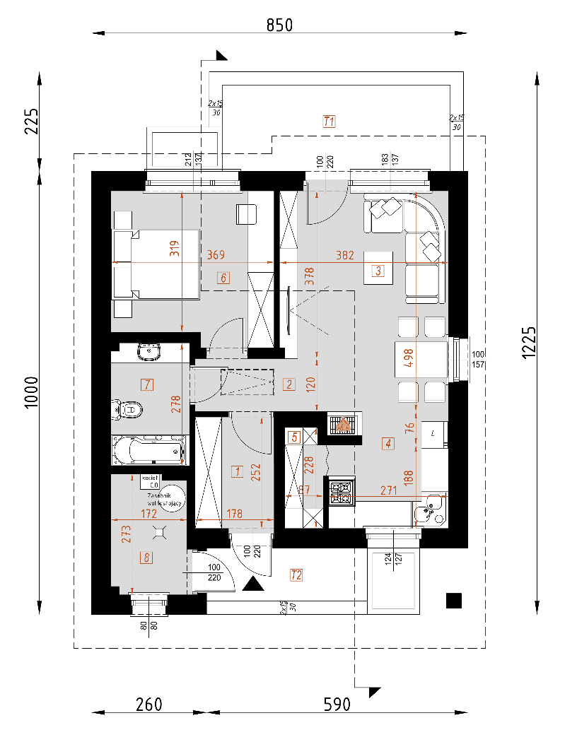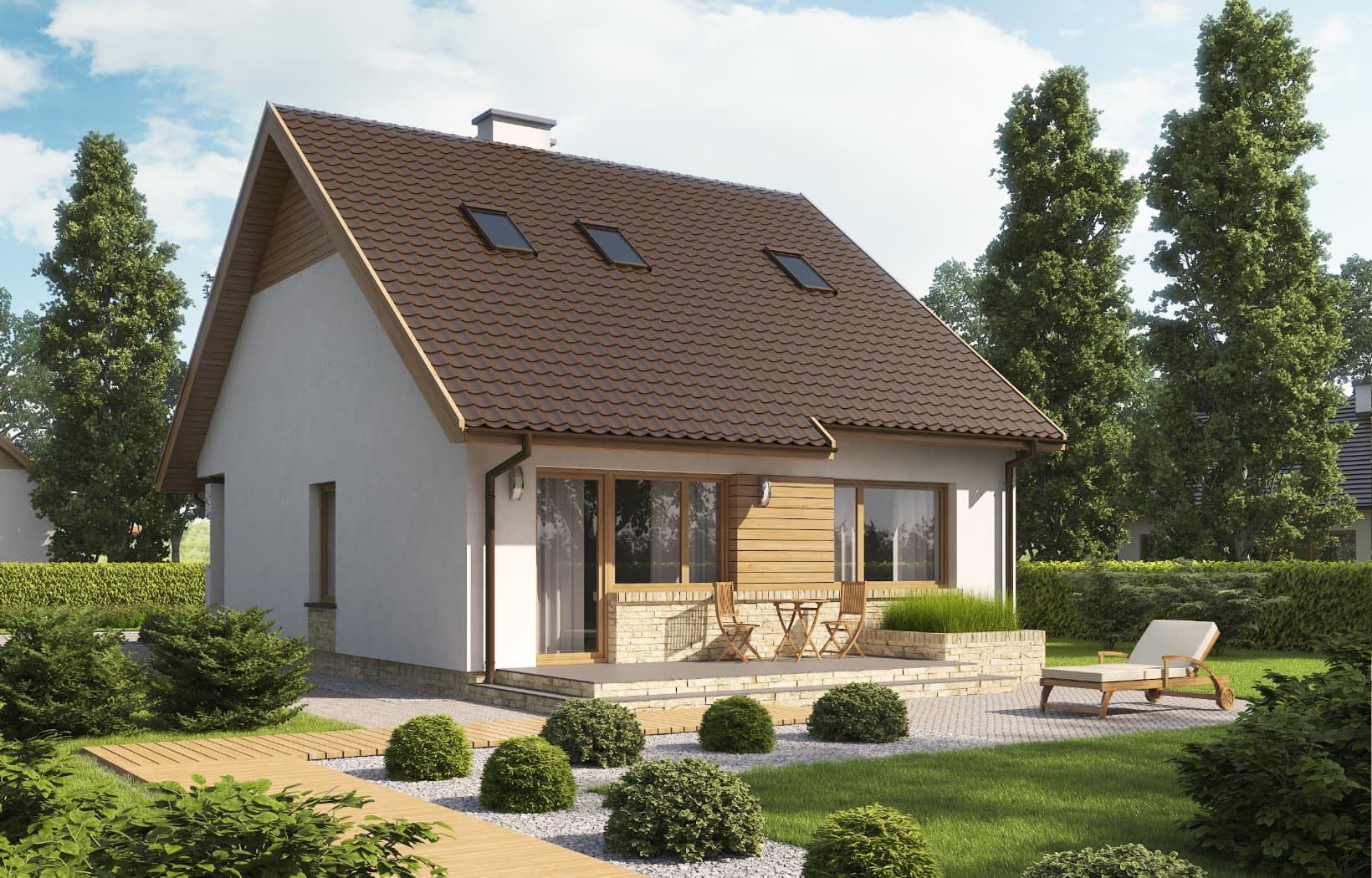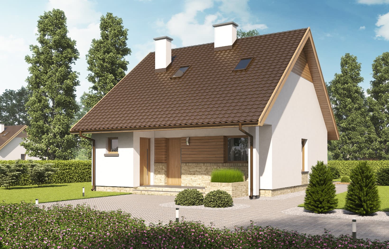 Nieduży parterowy dom zaprojektowany w technologii tradycyjnej z możliwością dobudowania, we własnym zakresie, garażu lub wiaty. Może też pełnić funkcję wygodnego domu letniego. Istnieje możliwość adaptacji strychu na cele mieszkalne.Konstrukcja