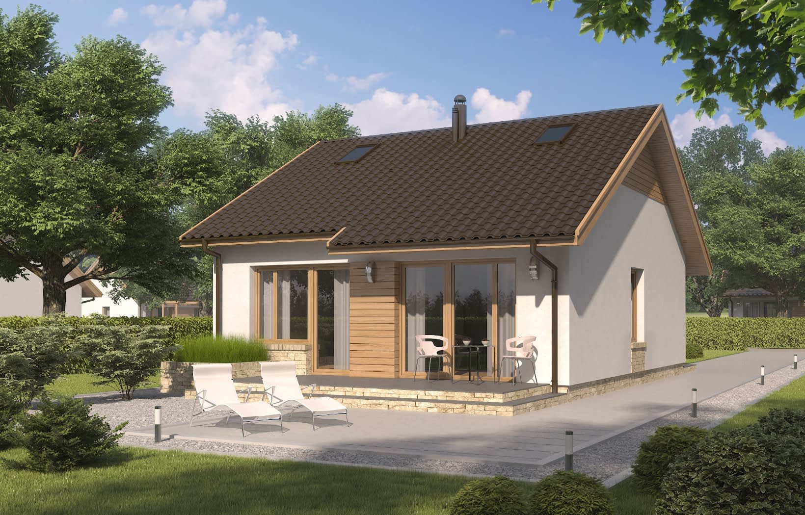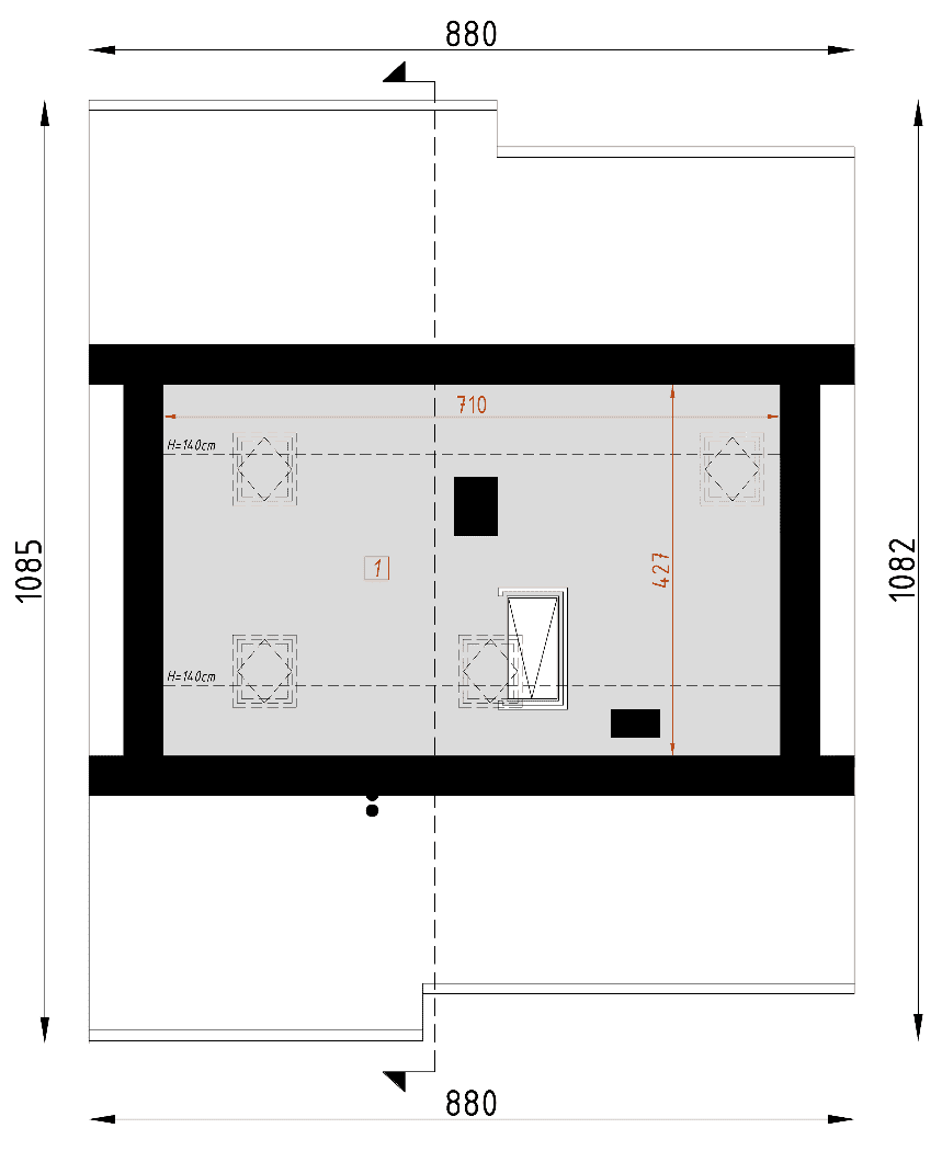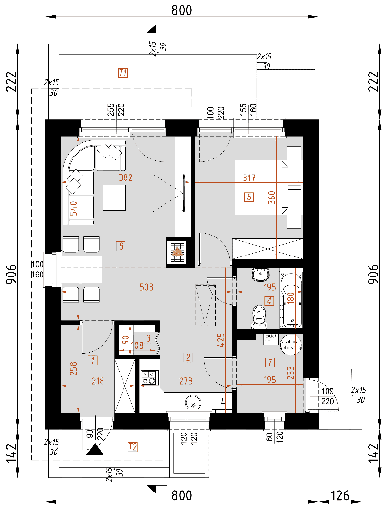 Dom D142 jest skierowany do naszych klientów, szukających niewielkiego, nowoczesnego domu parterowego. Prosta, czysta bryła oraz harmonijny podział w elewacjach czynią ten dom klasycznie eleganckim. Podstawowym założeniem przyjętym przy projekcie budynku było stworzenie funkcjonalnego i ciekawego wnętrza na niewielkim metrażu. Jest to budynek parterowy kryty dwuspadowym dachem z możliwością adaptacji poddasza. W elewacji budynku poprzez materiał zaakcentowano wyraźnie, strefę wejściową. W bryle budynku oddzielono także funkcję mieszkalną dzienną od nocnej, jak również strefę mieszkalną i strefy gospodarczej.Konstrukcja