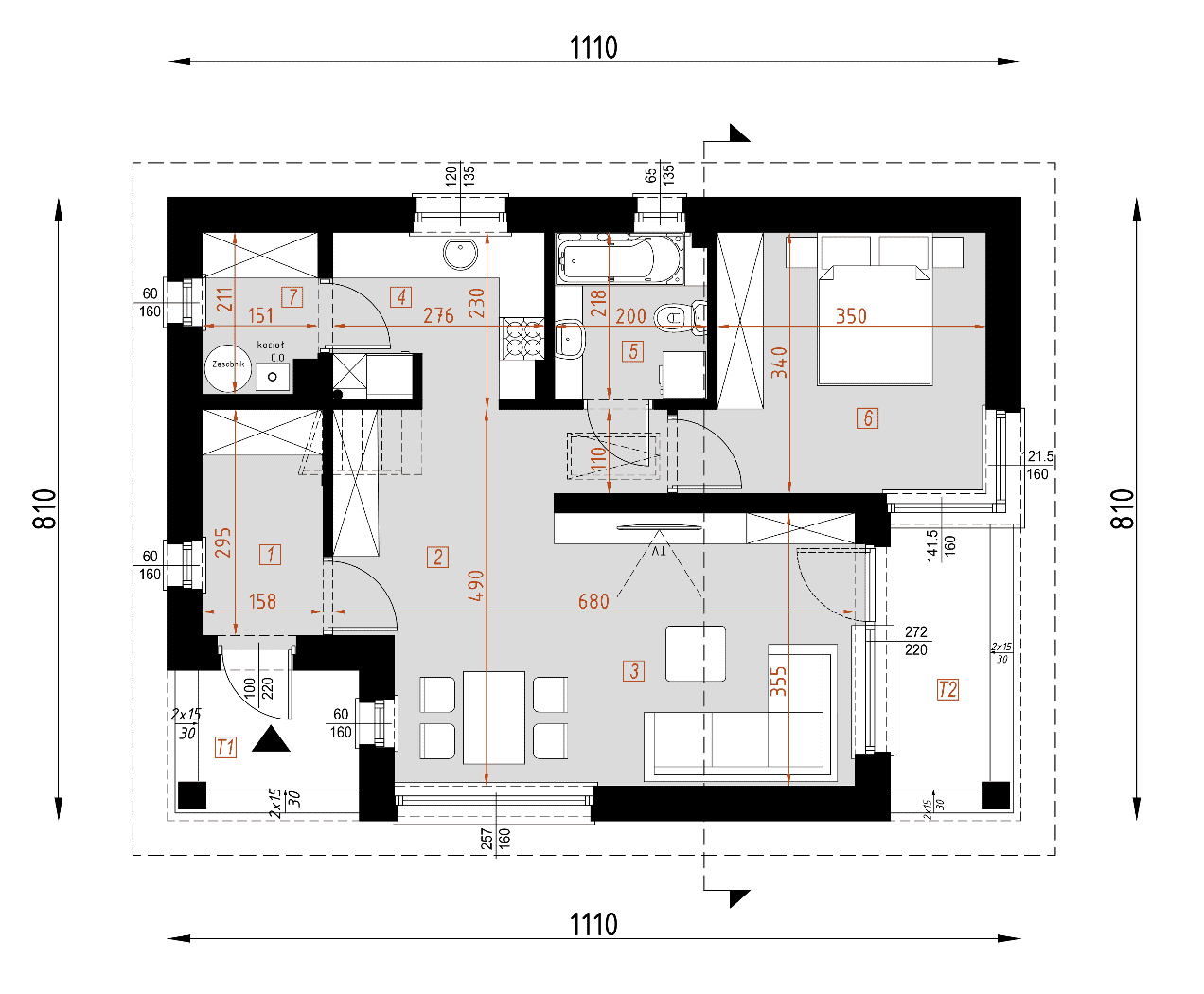 - rzuty wszystkich kondygnacji (np. parter, piwnica, piętro) – rozmieszczenie i wymiary wszystkich pomieszczeń, rozmieszczenie i wielkość otworów okiennych i drzwiowych, rozmieszczenie kominów, sugerowana aranżacja wnętrz.