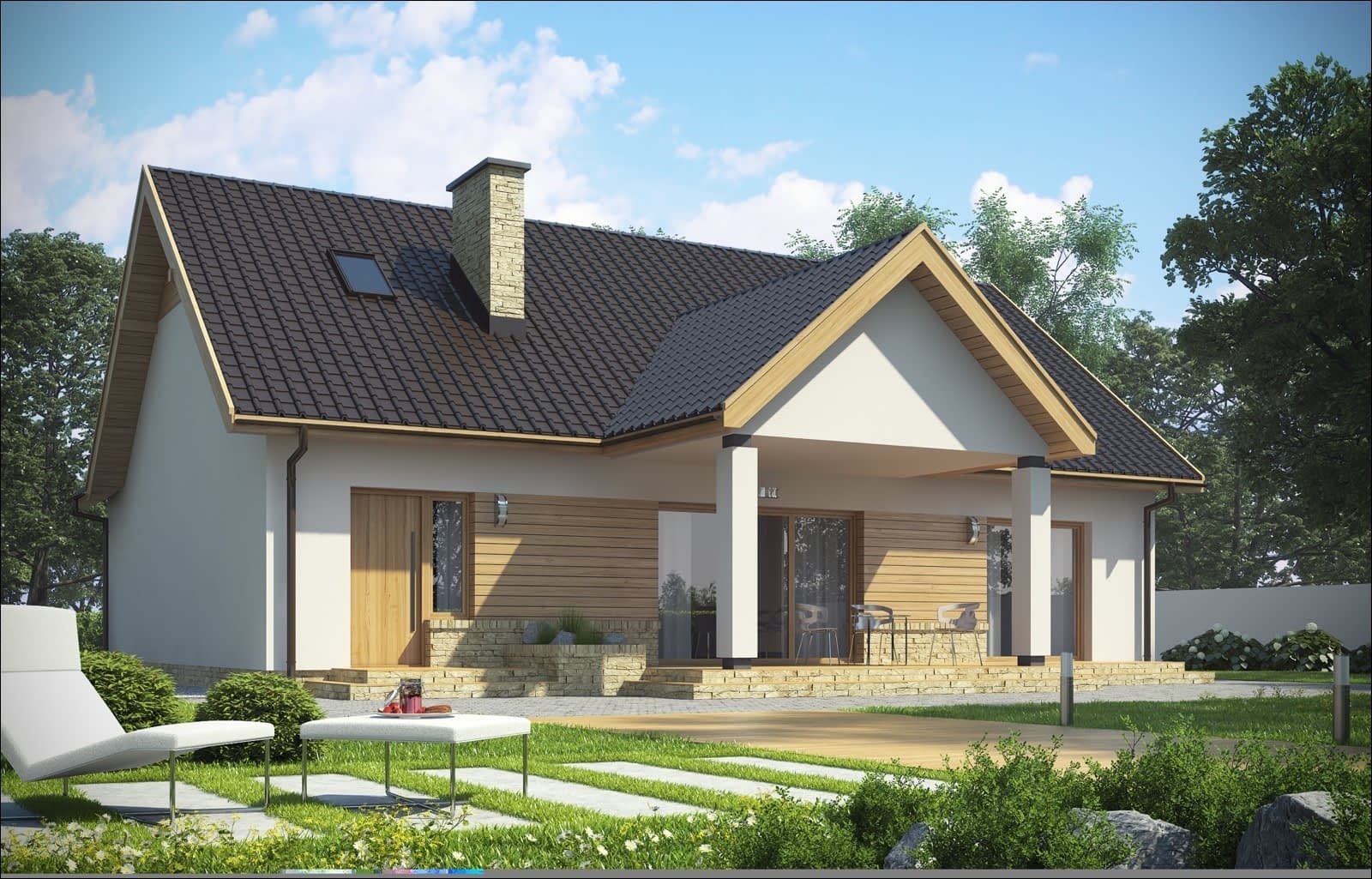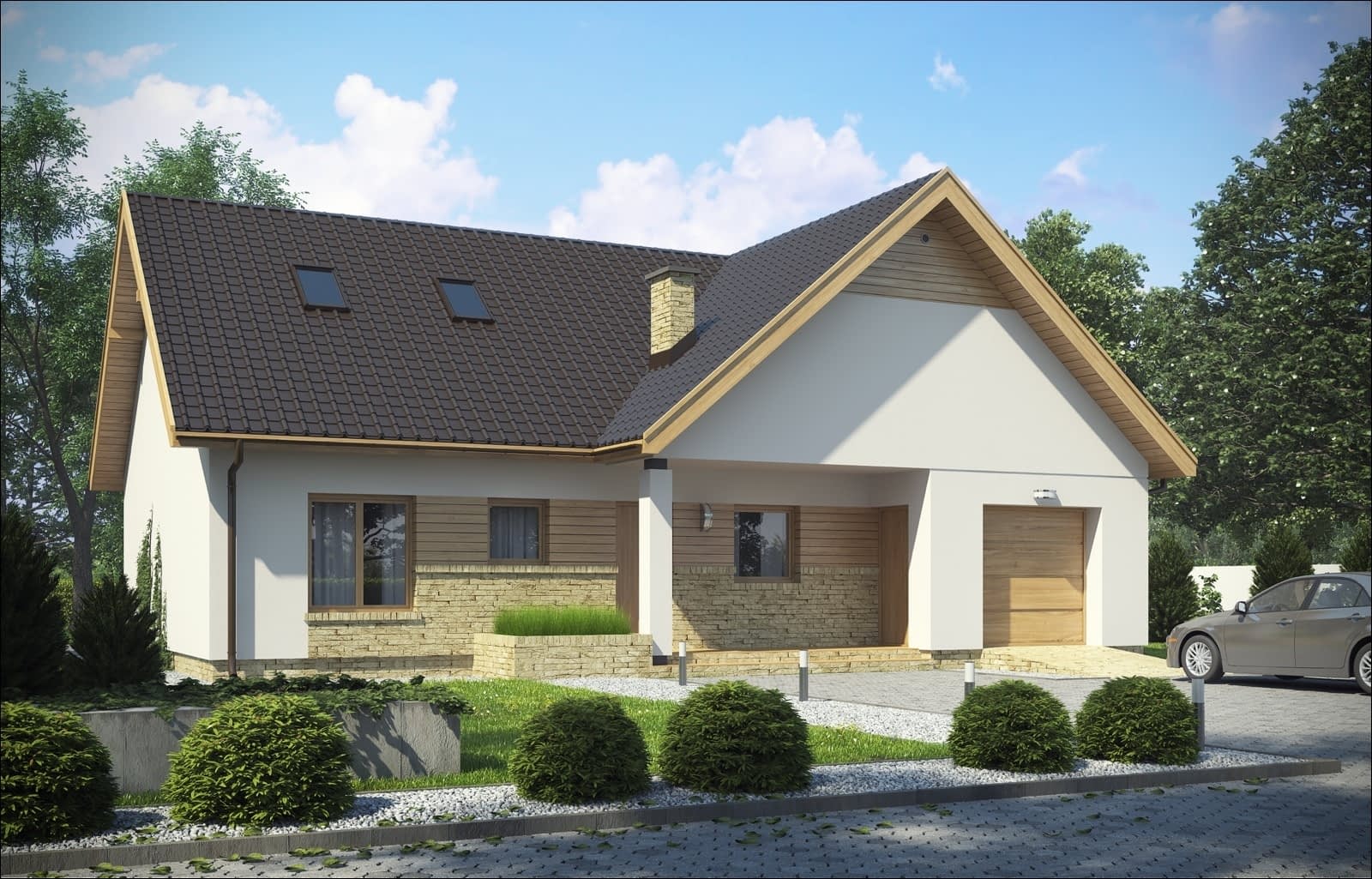 Dom D147 jest skierowany do naszych klientów, szukających niewielkiego, nowoczesnego domu parterowego z poddaszem do adaptacji i garażem. Prosta, czysta bryła oraz harmonijny podział w elewacjach czynią ten dom klasycznie eleganckim. Podstawowym założeniem przyjętym przy projekcie budynku było stworzenie funkcjonalnego i ciekawego wnętrza na niewielkim metrażu. Jest to budynek z poddaszem użytkowym, kryty dwuspadowym dachem. W elewacji budynku poprzez materiał zaakcentowano wyraźnie, strefę wejściową. W bryle budynku oddzielono także funkcję mieszkalną dzienną od nocnej, jak również strefę mieszkalną i strefy gospodarczej z dużą kotłownią.Konstrukcja