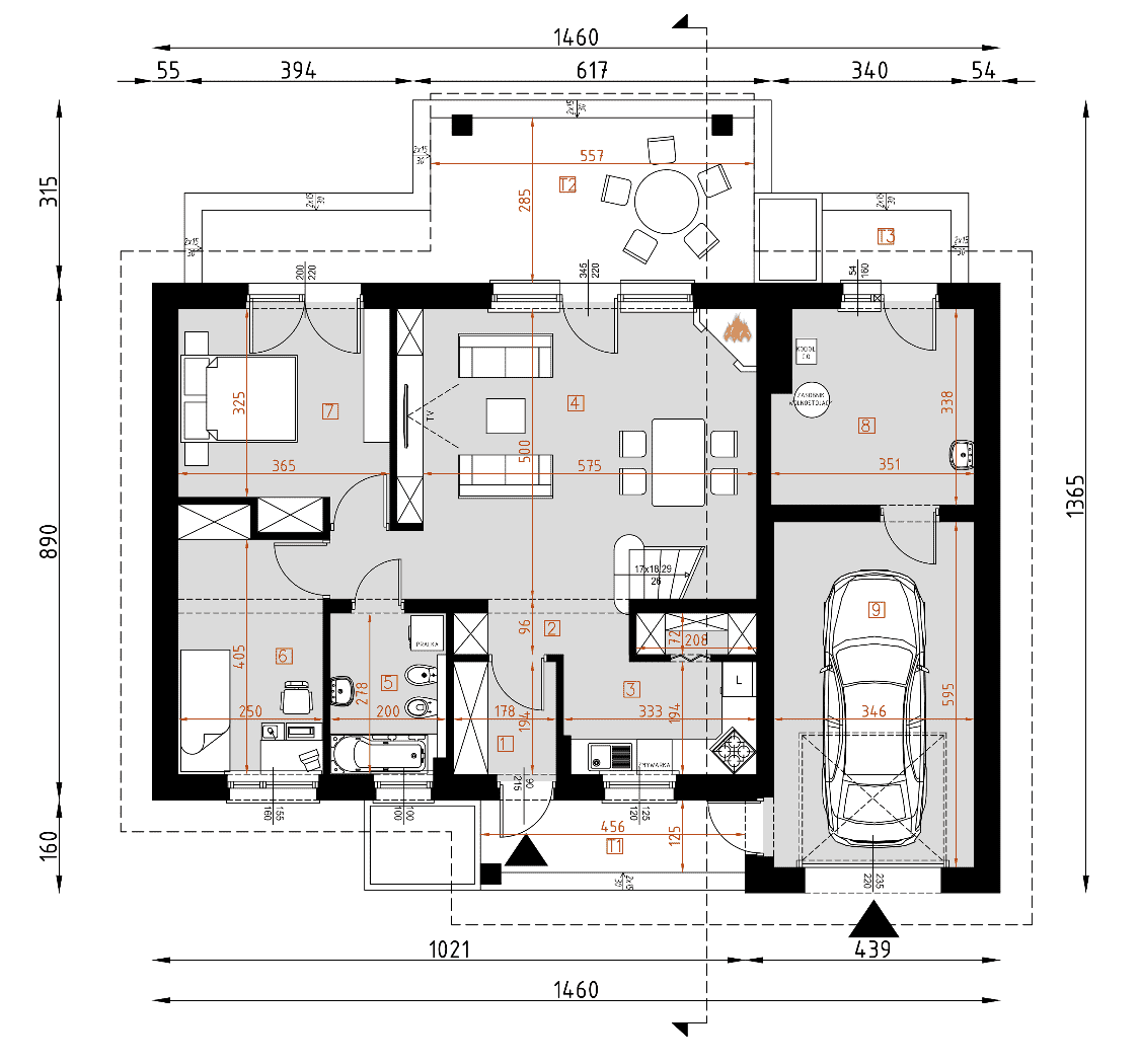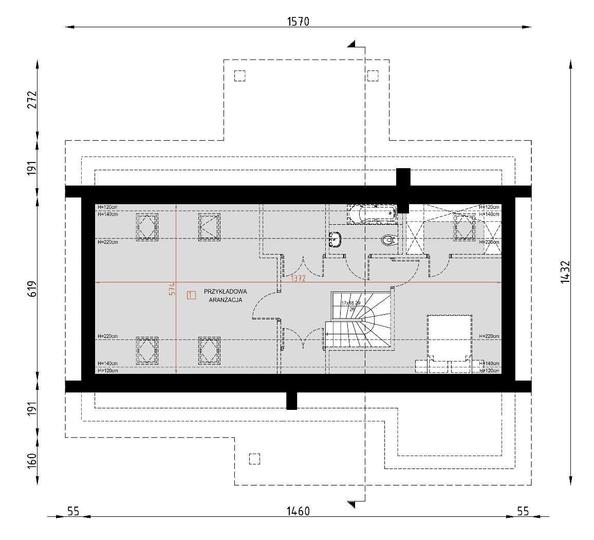 - rzuty wszystkich kondygnacji (np. parter, piwnica, piętro) – rozmieszczenie i wymiary wszystkich pomieszczeń, rozmieszczenie i wielkość otworów okiennych i drzwiowych, rozmieszczenie kominów, sugerowana aranżacja wnętrz.