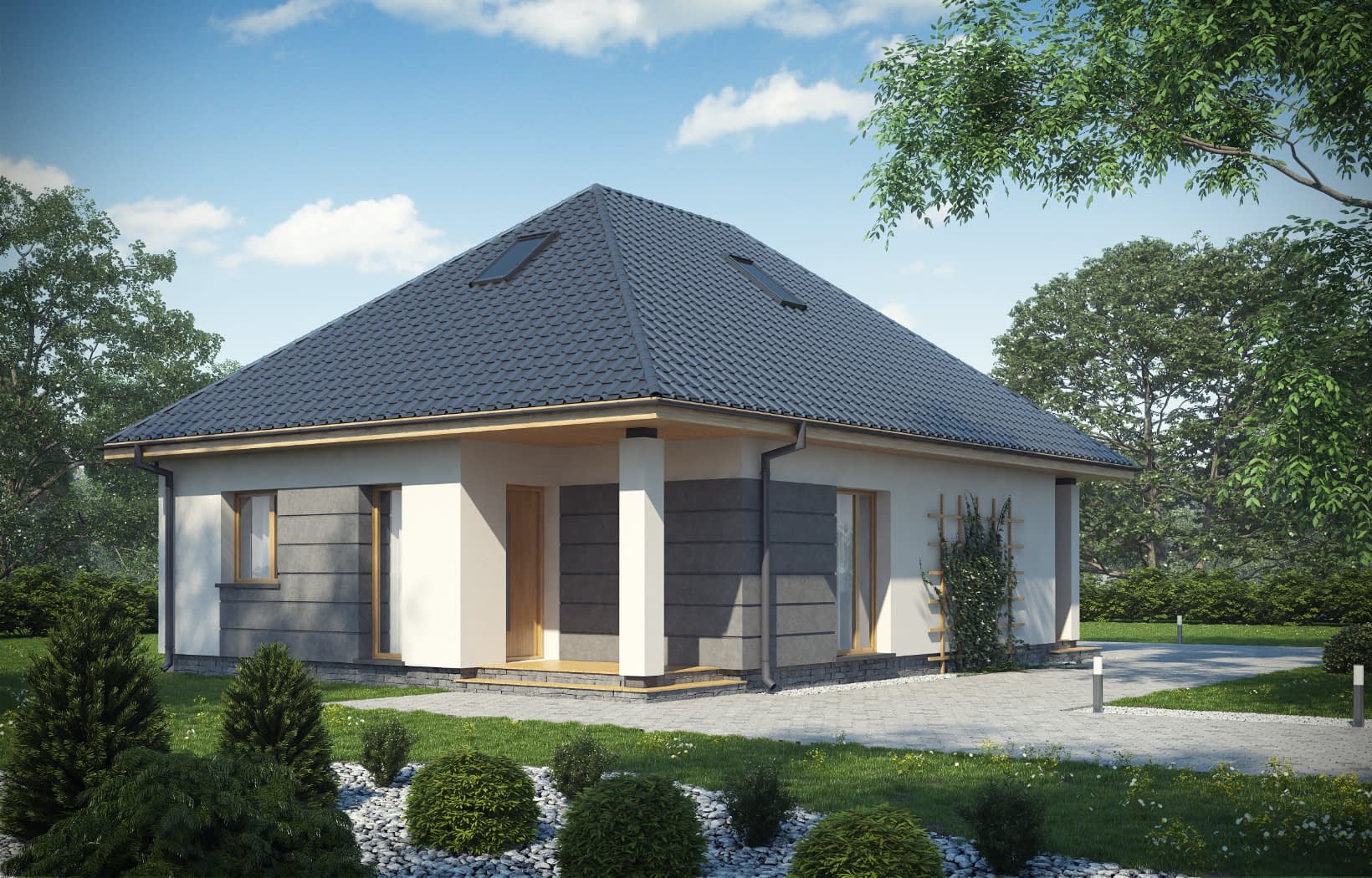 Dom D148B jest skierowany do naszych klientów, szukających niewielkiego, nowoczesnego domu parterowego z możliwością adaptacji nieużytkowego poddasza. Prosta, czysta bryła oraz harmonijny podział w elewacjach czynią ten dom klasycznie eleganckim oraz tańszym w budowie i późniejszej eksploatacji. Podstawowym założeniem przyjętym przy projekcie budynku było stworzenie funkcjonalnego i ciekawego wnętrza na niewielkim metrażu. Jest to budynek parterowy kryty kopertowym dachem z możliwością późniejszej adaptacji poddasza. W elewacji budynku poprzez materiał zaakcentowano wyraźnie, strefę wejściową. W bryle budynku oddzielono także funkcję mieszkalną dzienną od nocnej, jak również strefę mieszkalną od strefy gospodarczej.Konstrukcja