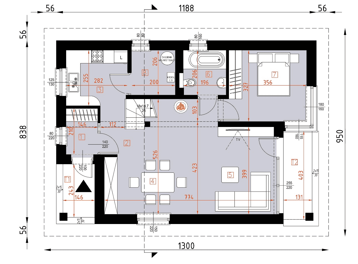 - rzuty wszystkich kondygnacji (np. parter, piwnica, piętro) – rozmieszczenie i wymiary wszystkich pomieszczeń, rozmieszczenie i wielkość otworów okiennych i drzwiowych, rozmieszczenie kominów, sugerowana aranżacja wnętrz.