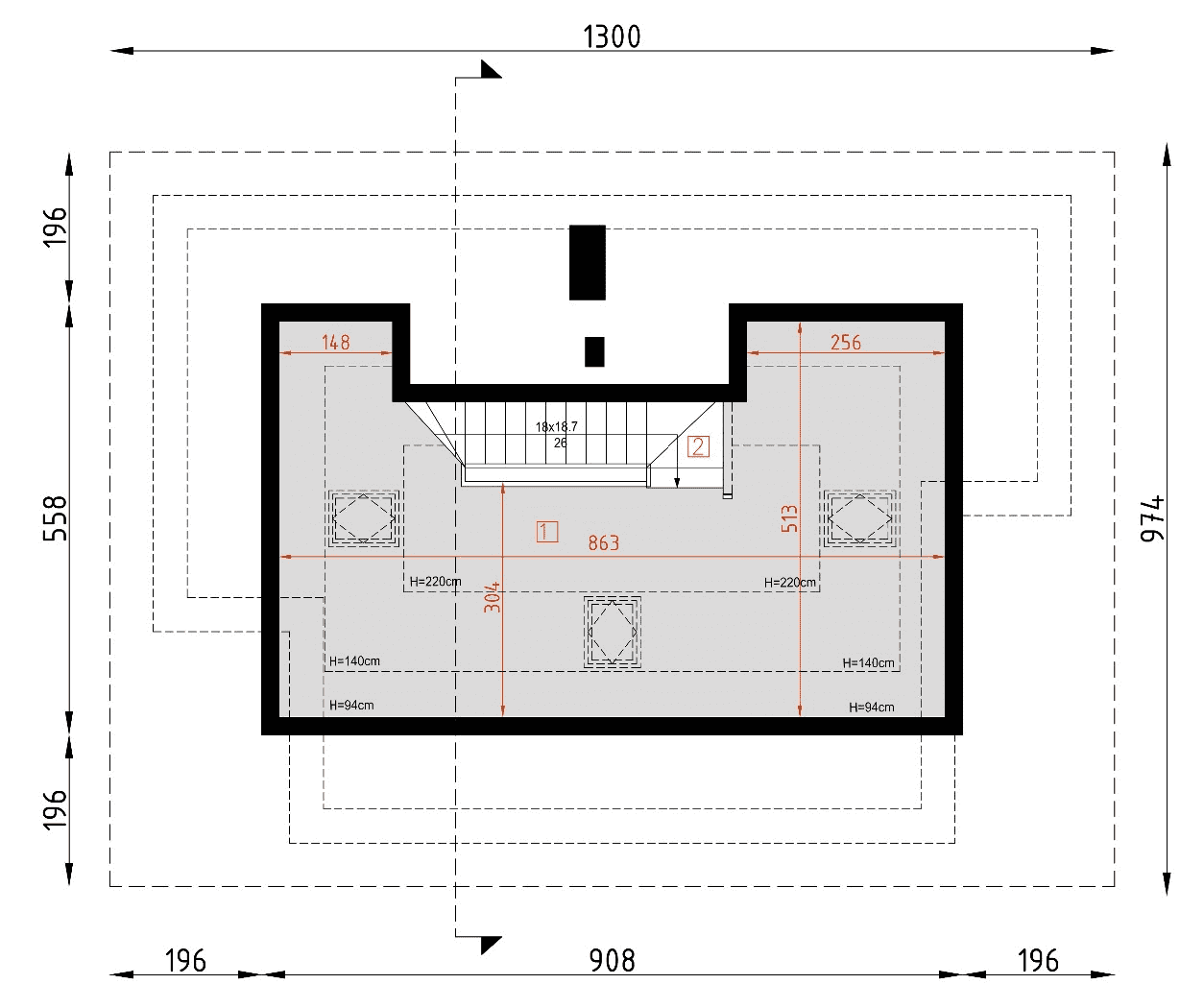 - rzut fundamentów – dokładne rozmieszczenie fundamentów, wymiary ław fundamentowych i głębokość ich posadowienia.