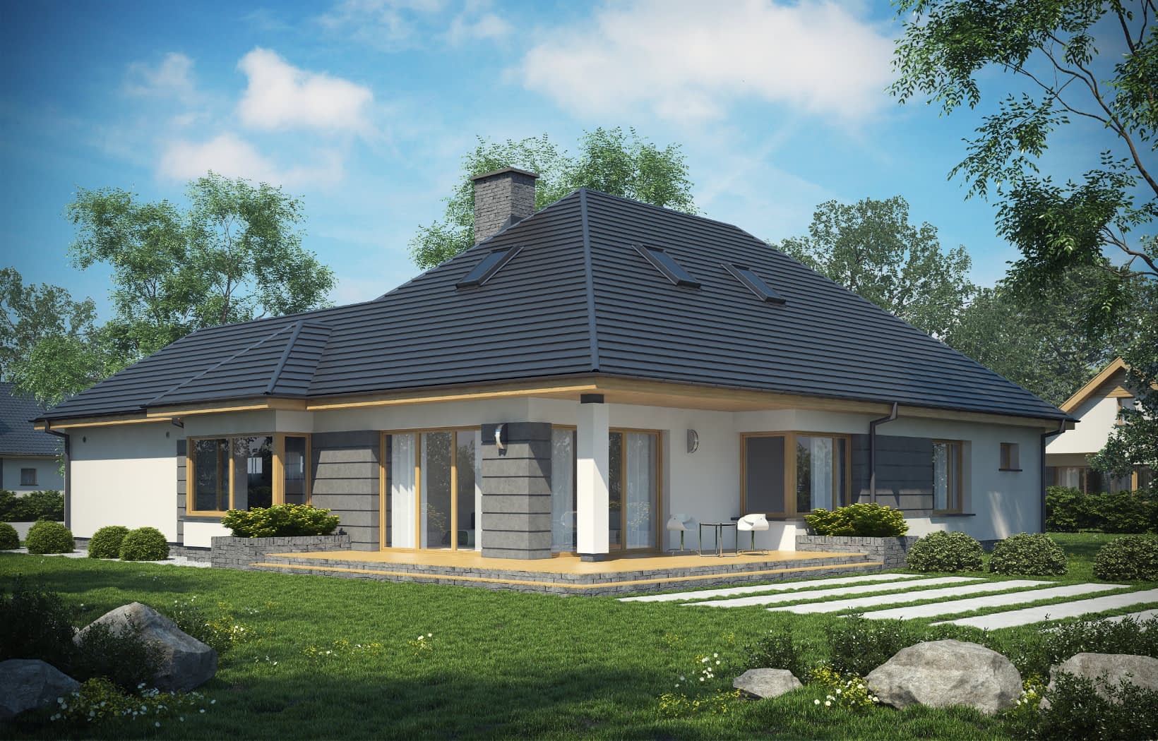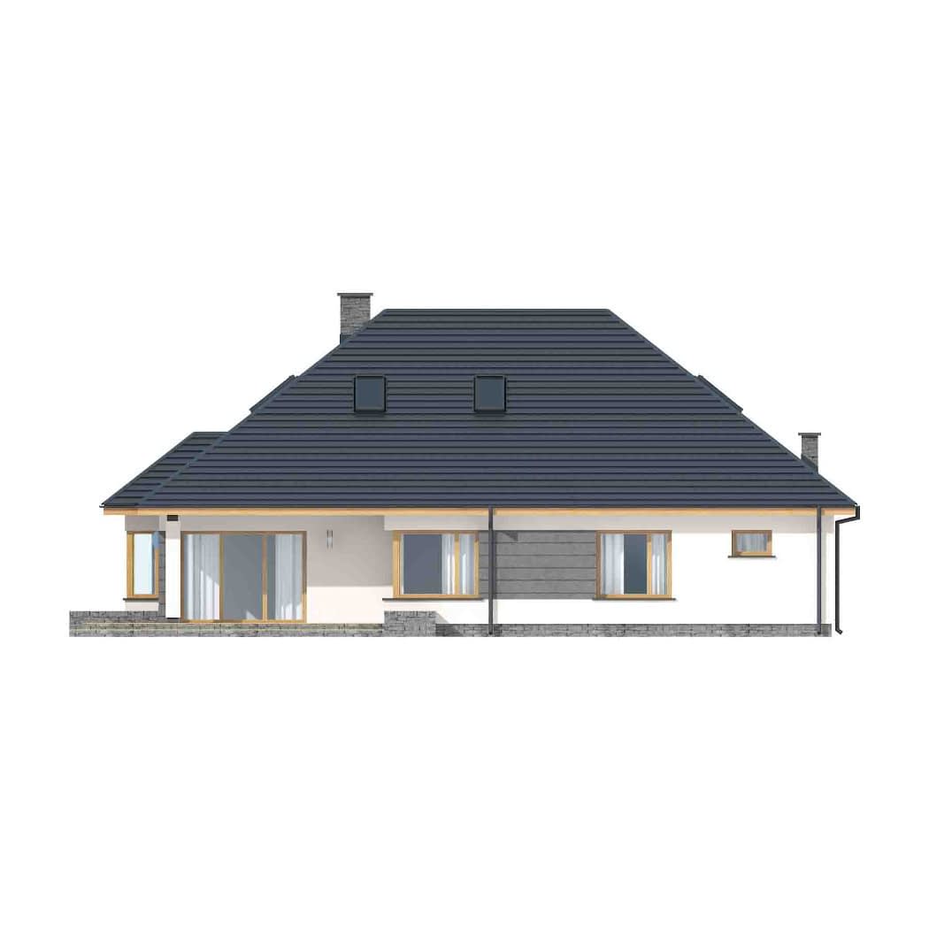 - elewacje (frontowa, dwie elewacje boczne, ogrodowa) – dokładny wygląd domu z każdej strony.