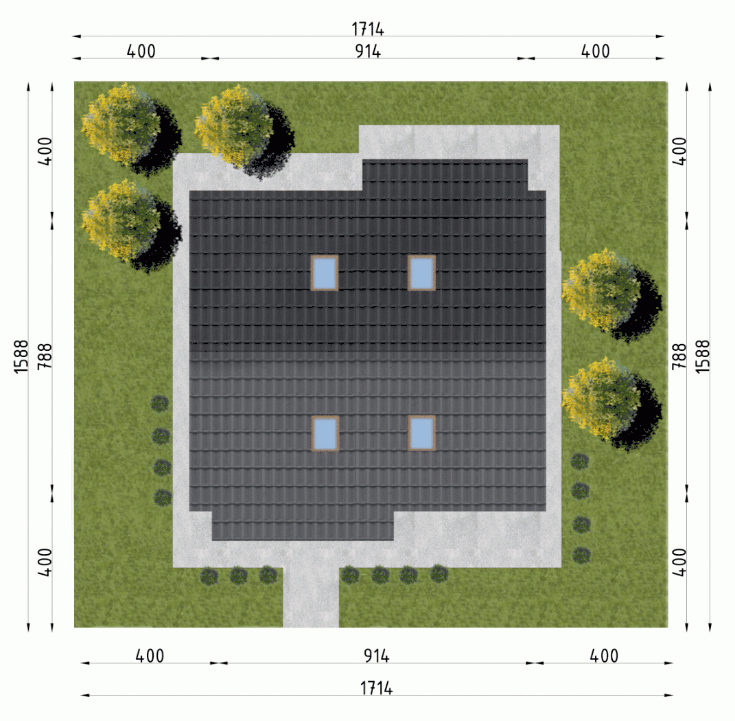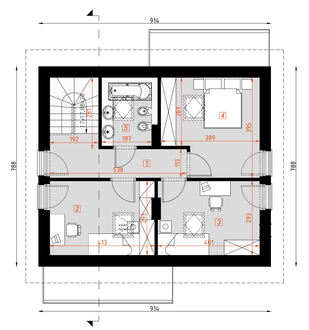 - rzut dachu – wymiary dachu, kąt nachylenia wszystkich połaci dachu, rozmieszczenie okien połaciowych, lukarn, kominów.