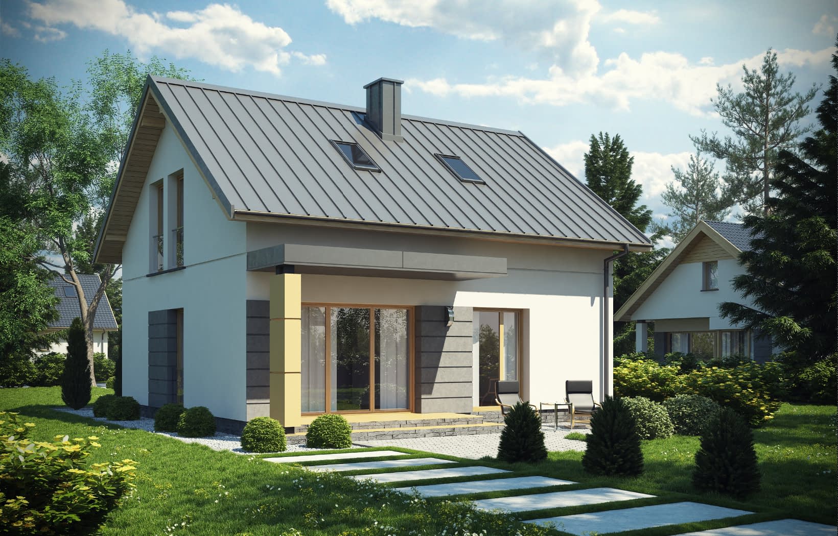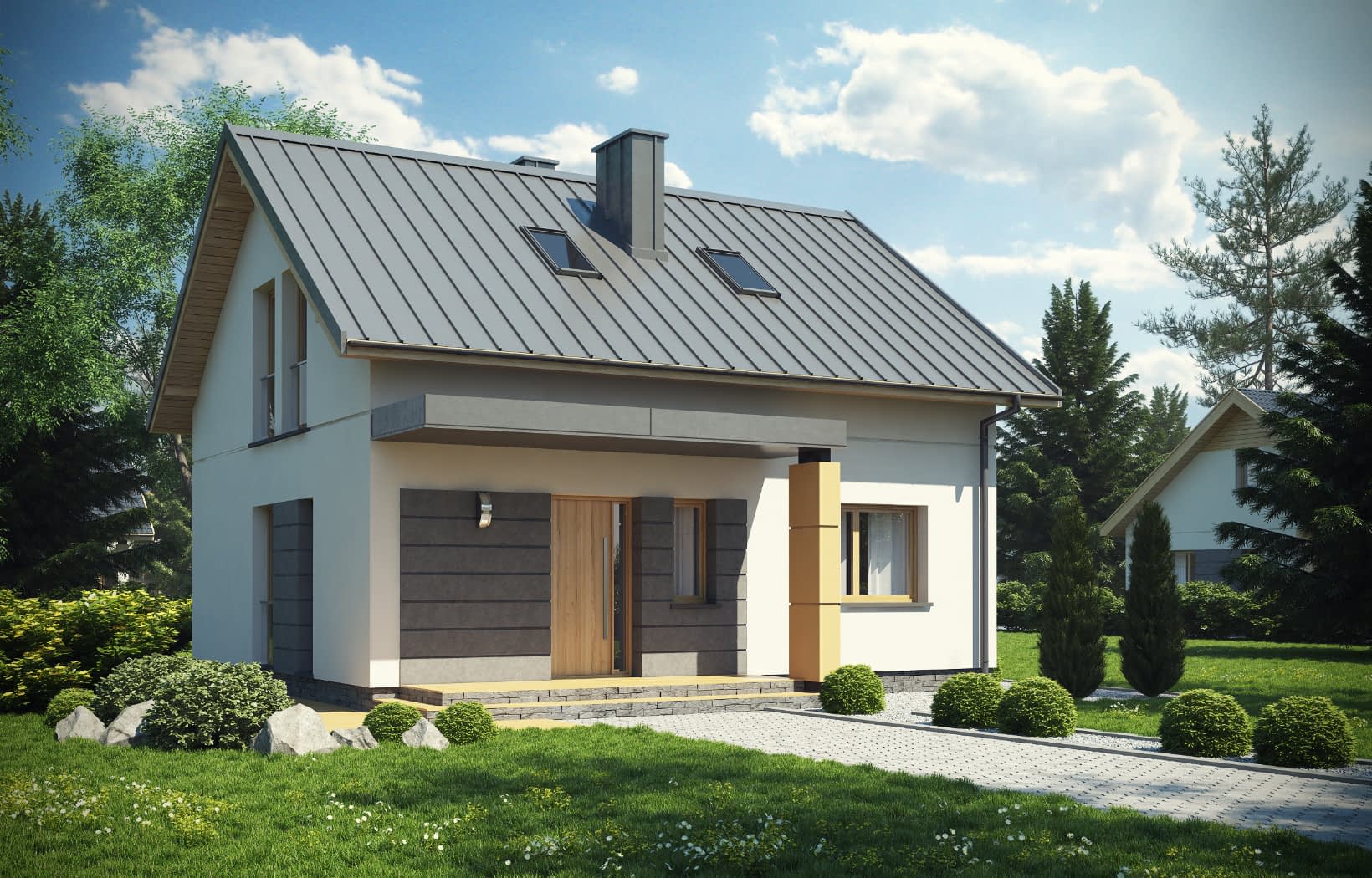 - elewacje (frontowa, dwie elewacje boczne, ogrodowa) – dokładny wygląd domu z każdej strony.