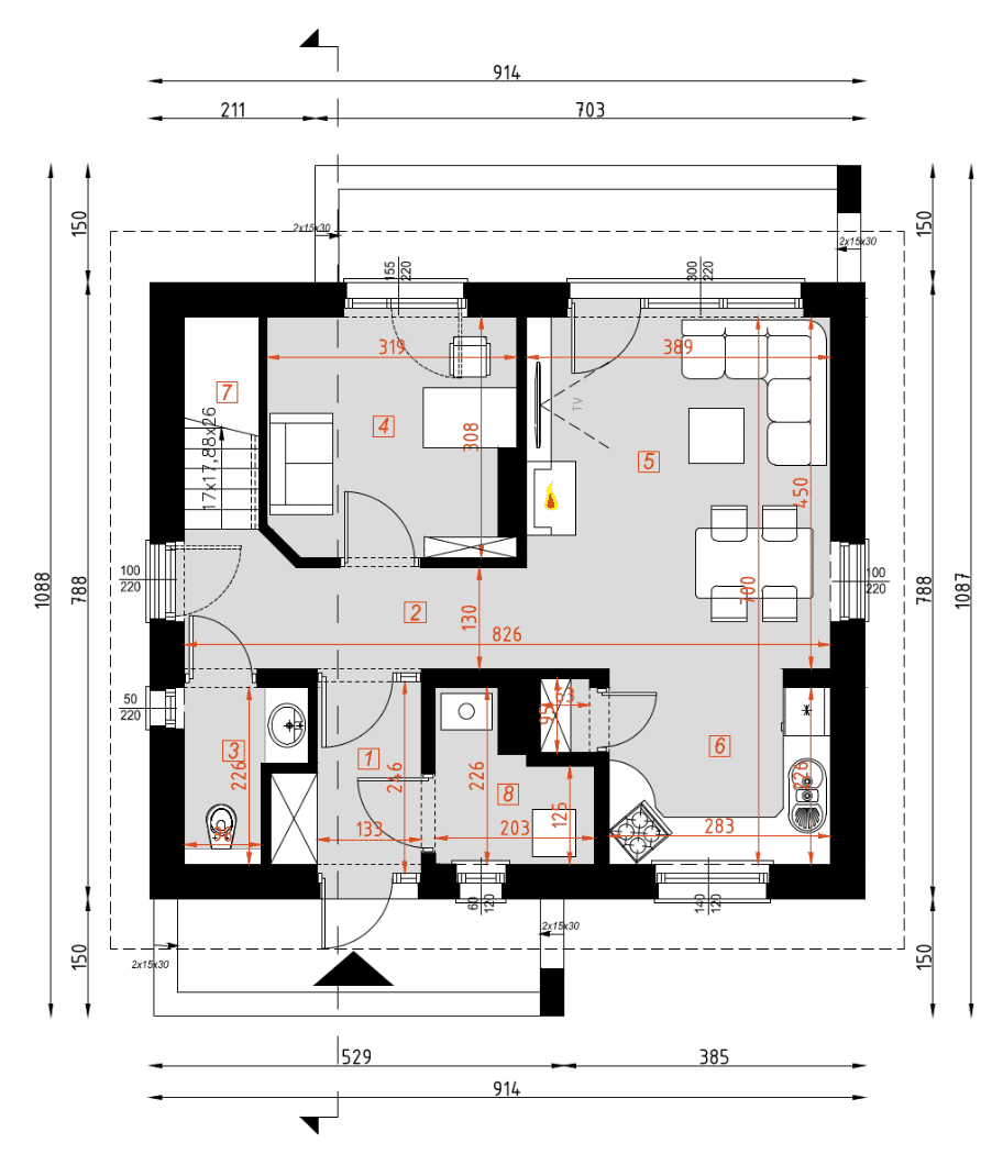 - rzuty wszystkich kondygnacji (np. parter, piwnica, piętro) – rozmieszczenie i wymiary wszystkich pomieszczeń, rozmieszczenie i wielkość otworów okiennych i drzwiowych, rozmieszczenie kominów, sugerowana aranżacja wnętrz.