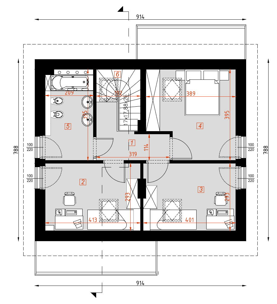 - rzuty wszystkich kondygnacji (np. parter, piwnica, piętro) – rozmieszczenie i wymiary wszystkich pomieszczeń, rozmieszczenie i wielkość otworów okiennych i drzwiowych, rozmieszczenie kominów, sugerowana aranżacja wnętrz.