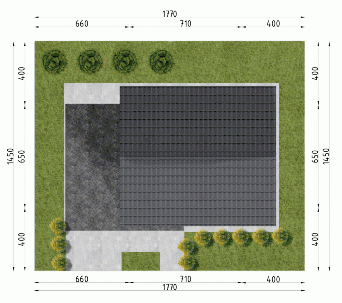 - elewacje (frontowa, dwie elewacje boczne, ogrodowa) – dokładny wygląd domu z każdej strony.