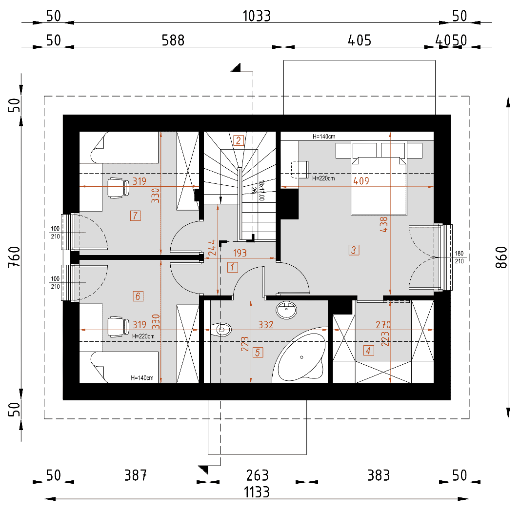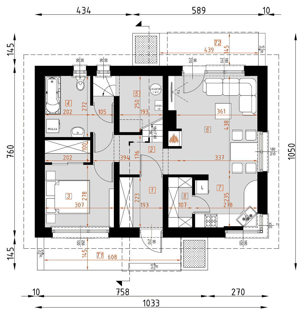 - rzuty wszystkich kondygnacji (np. parter, piwnica, piętro) – rozmieszczenie i wymiary wszystkich pomieszczeń, rozmieszczenie i wielkość otworów okiennych i drzwiowych, rozmieszczenie kominów, sugerowana aranżacja wnętrz.