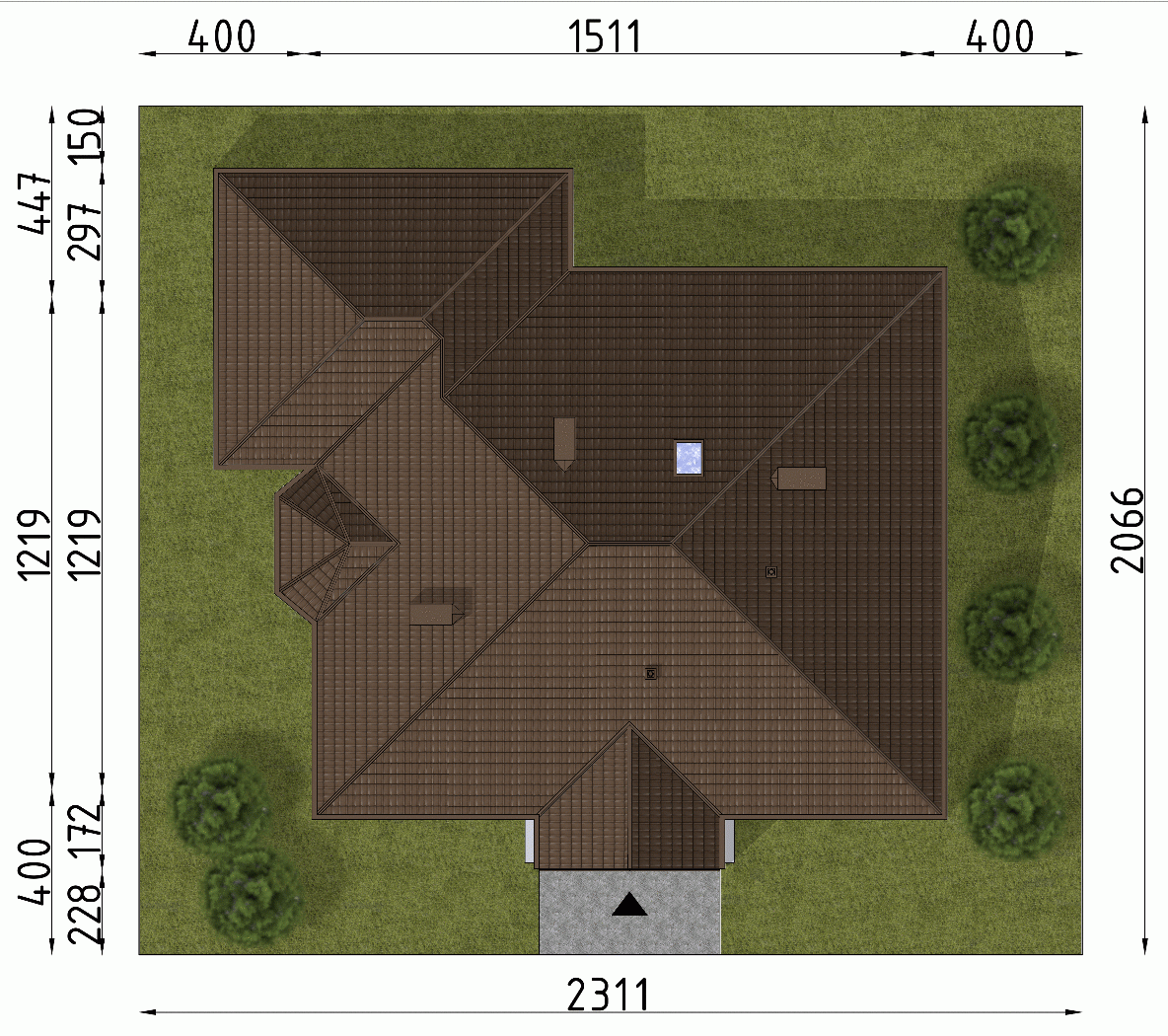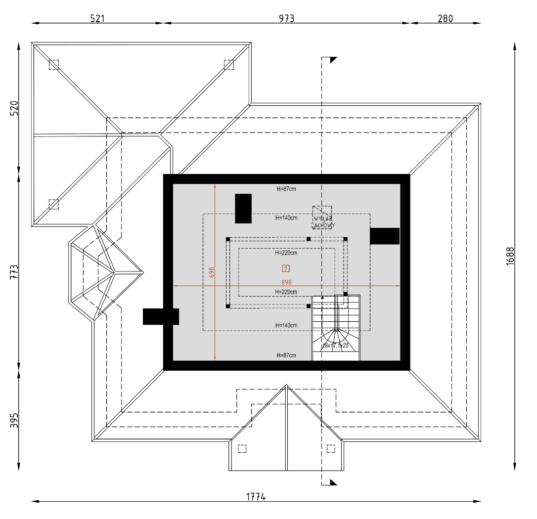 - rzut dachu – wymiary dachu, kąt nachylenia wszystkich połaci dachu, rozmieszczenie okien połaciowych, lukarn, kominów.