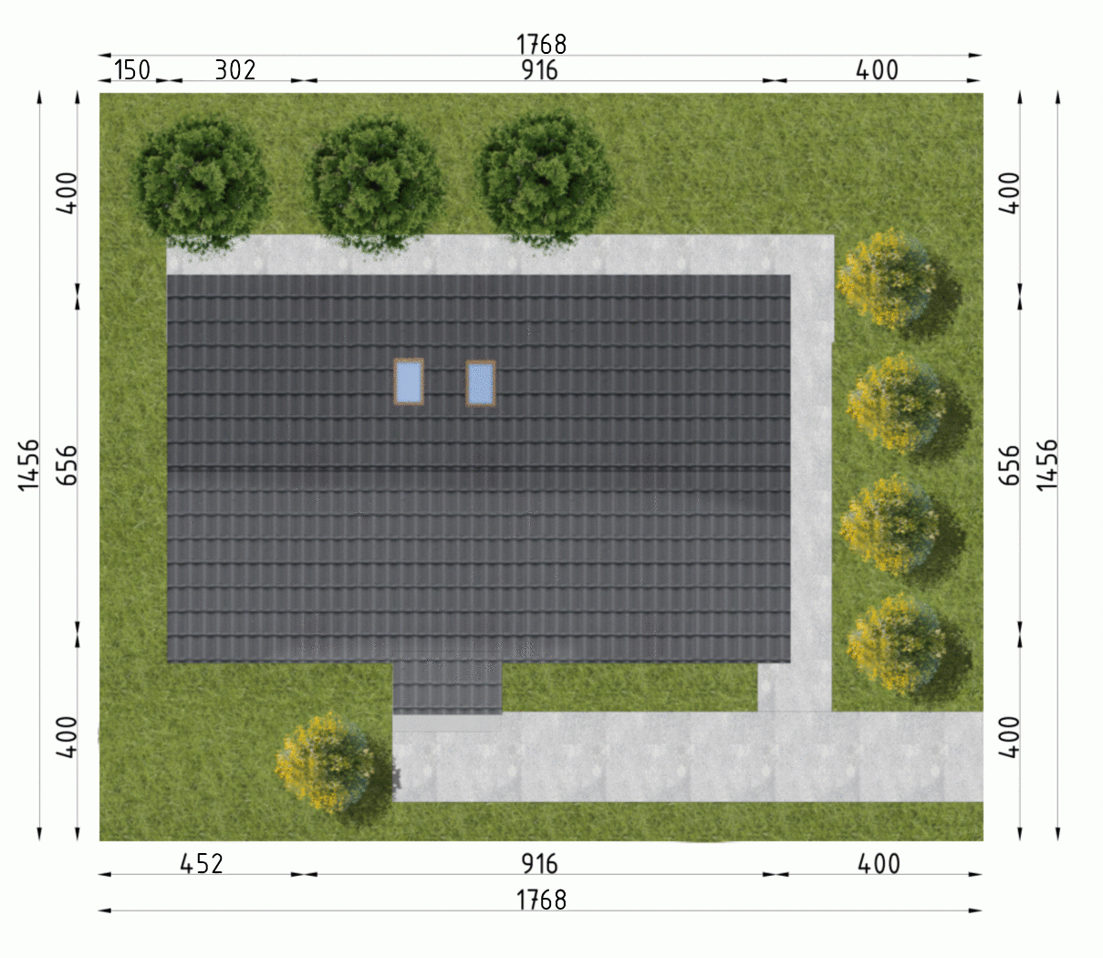 - Minimalne wymiary działki14.56 x 17.68m