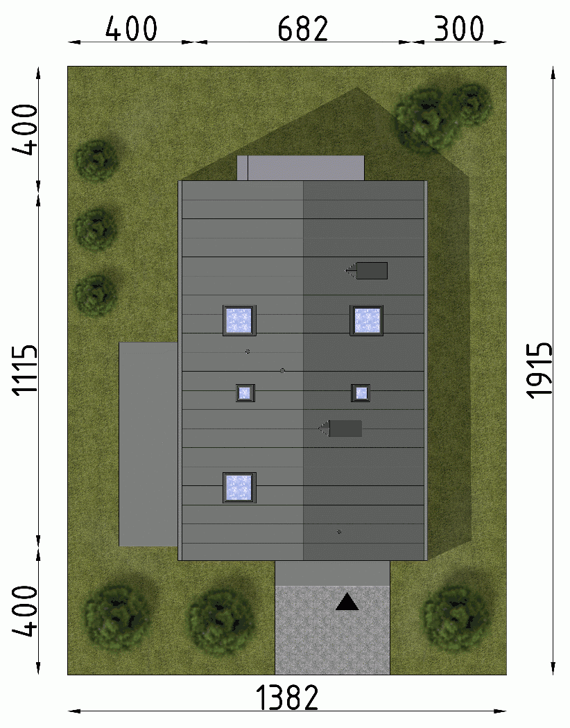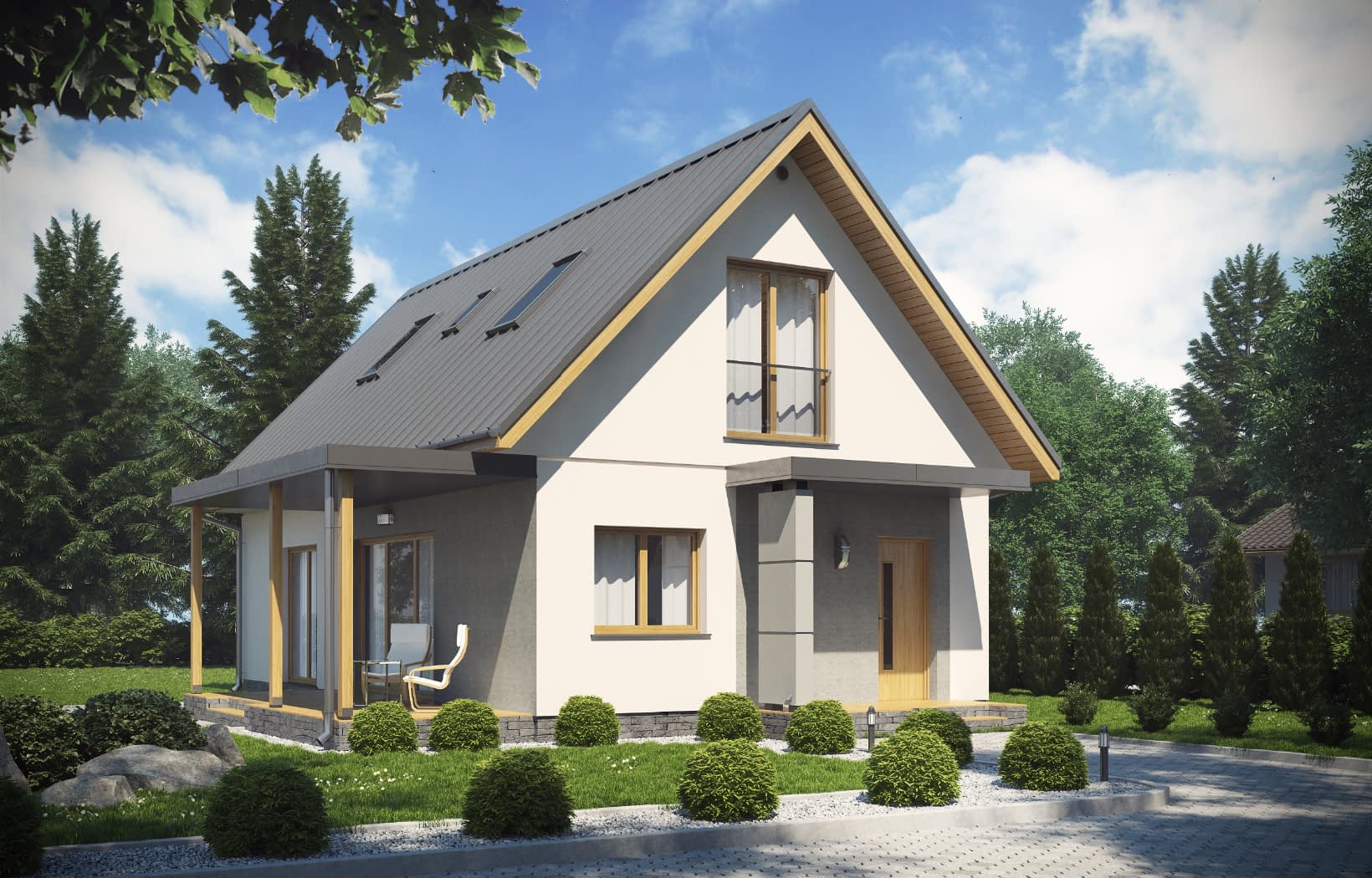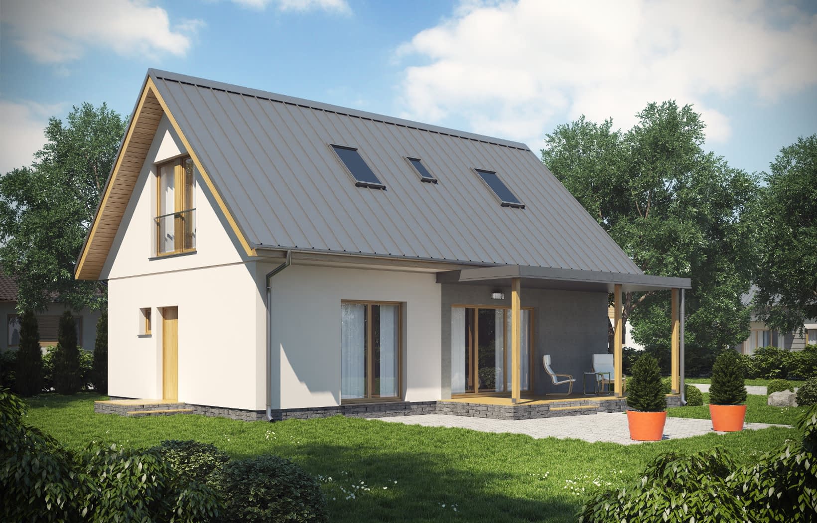 - elewacje (frontowa, dwie elewacje boczne, ogrodowa) – dokładny wygląd domu z każdej strony.