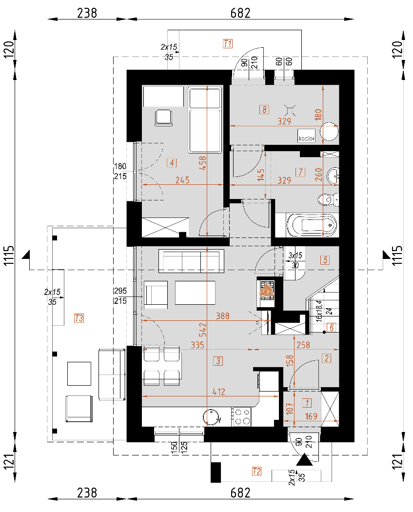 - rzuty wszystkich kondygnacji (np. parter, piwnica, piętro) – rozmieszczenie i wymiary wszystkich pomieszczeń, rozmieszczenie i wielkość otworów okiennych i drzwiowych, rozmieszczenie kominów, sugerowana aranżacja wnętrz.