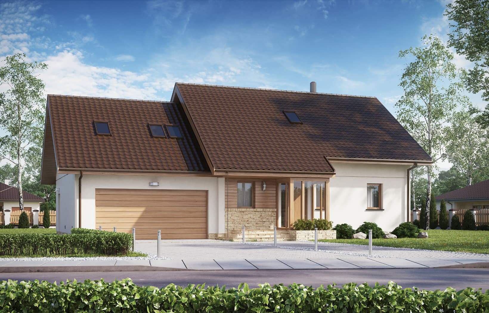 - elewacje (frontowa, dwie elewacje boczne, ogrodowa) – dokładny wygląd domu z każdej strony.