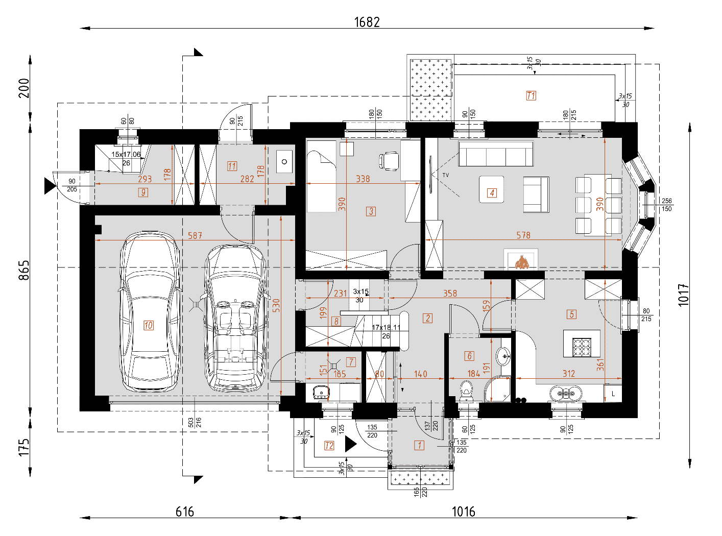 - rzuty wszystkich kondygnacji (np. parter, piwnica, piętro) – rozmieszczenie i wymiary wszystkich pomieszczeń, rozmieszczenie i wielkość otworów okiennych i drzwiowych, rozmieszczenie kominów, sugerowana aranżacja wnętrz.