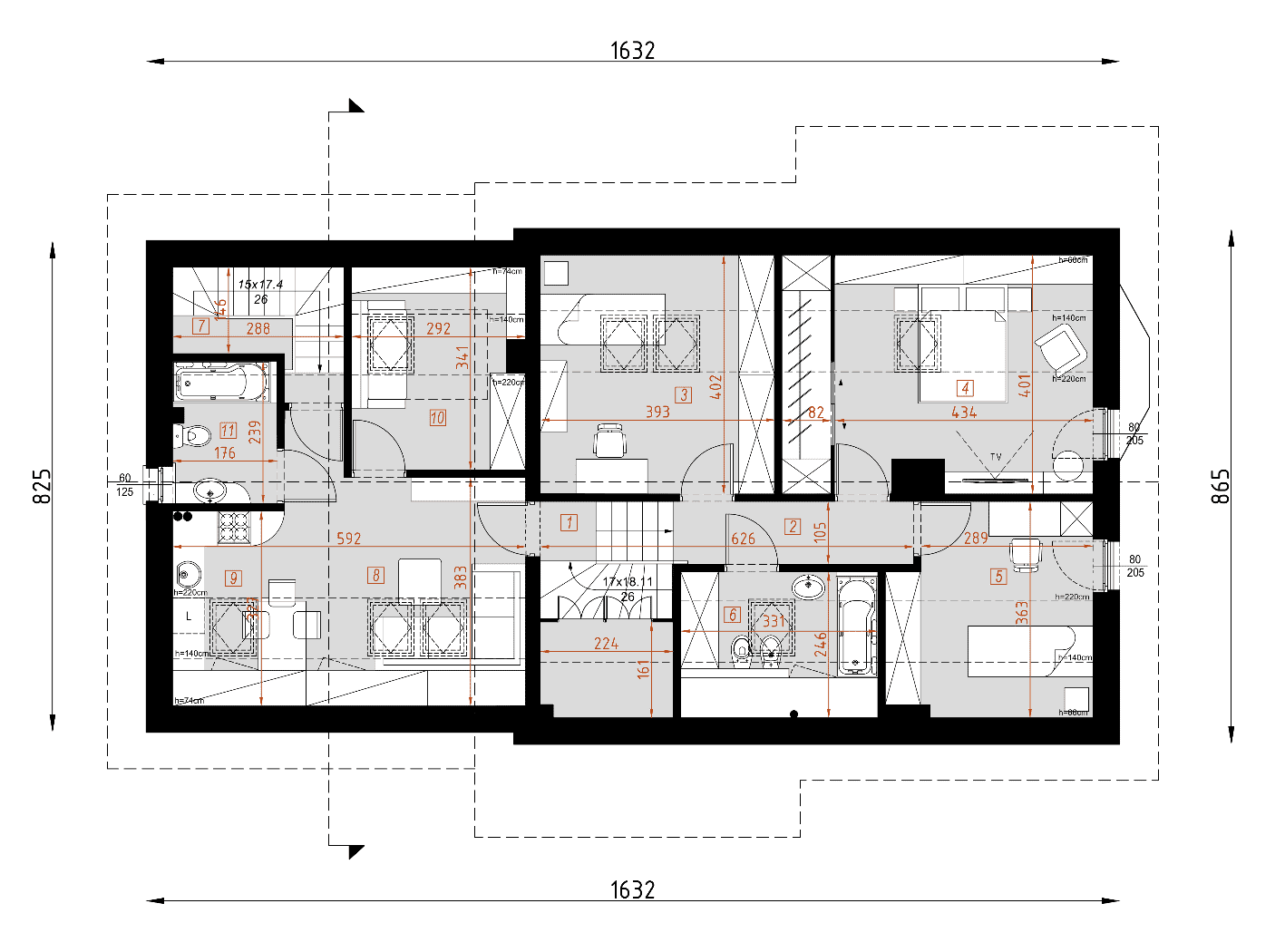 - rzut fundamentów – dokładne rozmieszczenie fundamentów, wymiary ław fundamentowych i głębokość ich posadowienia.