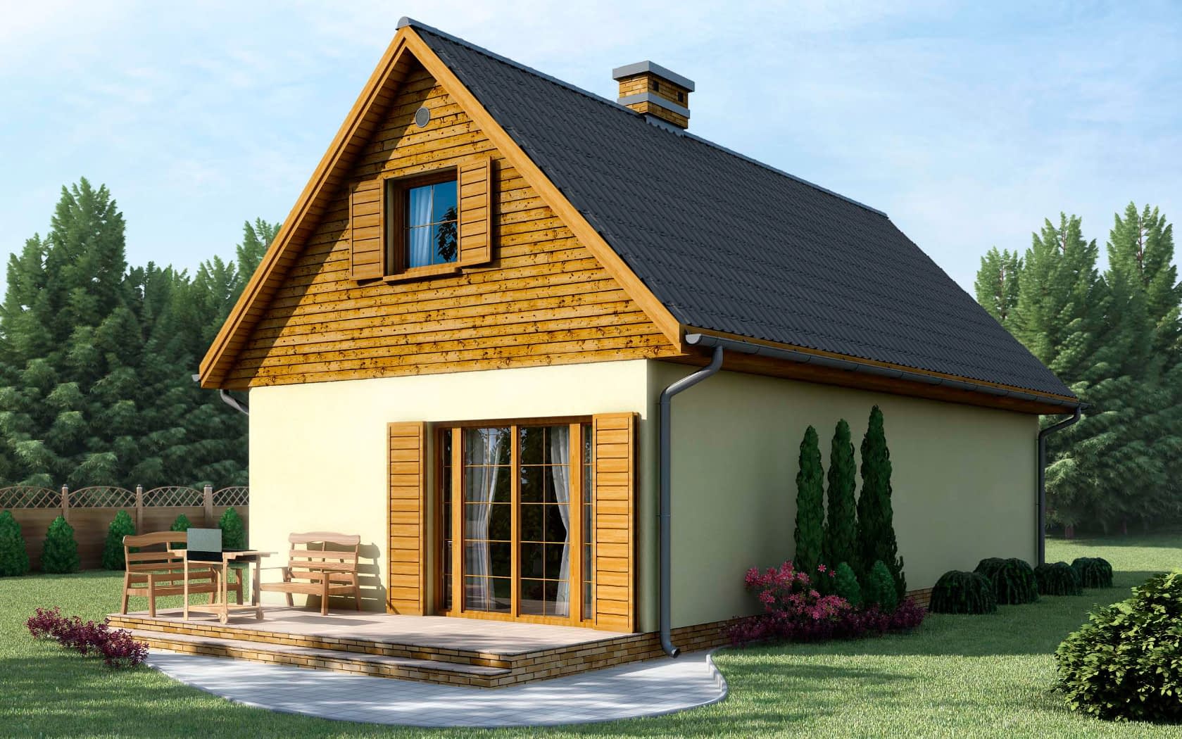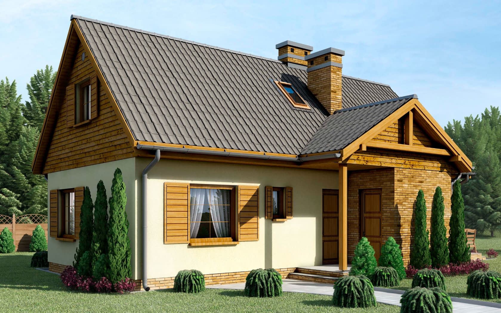 - elewacje (frontowa, dwie elewacje boczne, ogrodowa) – dokładny wygląd domu z każdej strony.