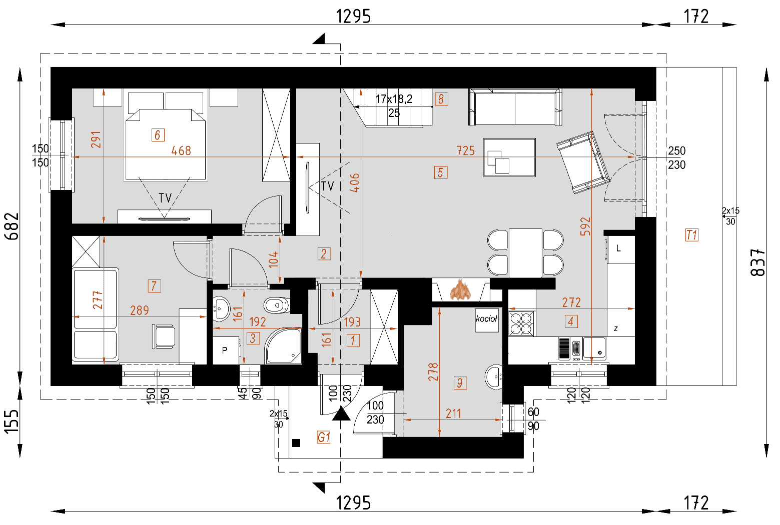 - rzuty wszystkich kondygnacji (np. parter, piwnica, piętro) – rozmieszczenie i wymiary wszystkich pomieszczeń, rozmieszczenie i wielkość otworów okiennych i drzwiowych, rozmieszczenie kominów, sugerowana aranżacja wnętrz.