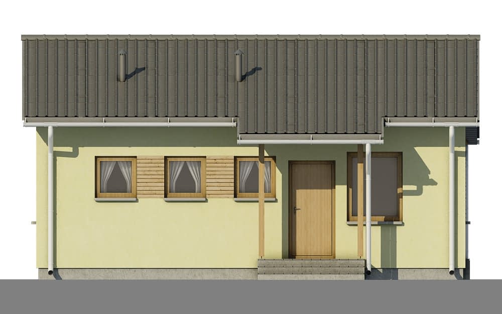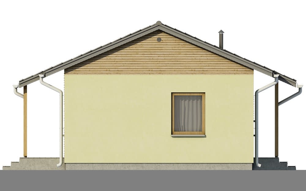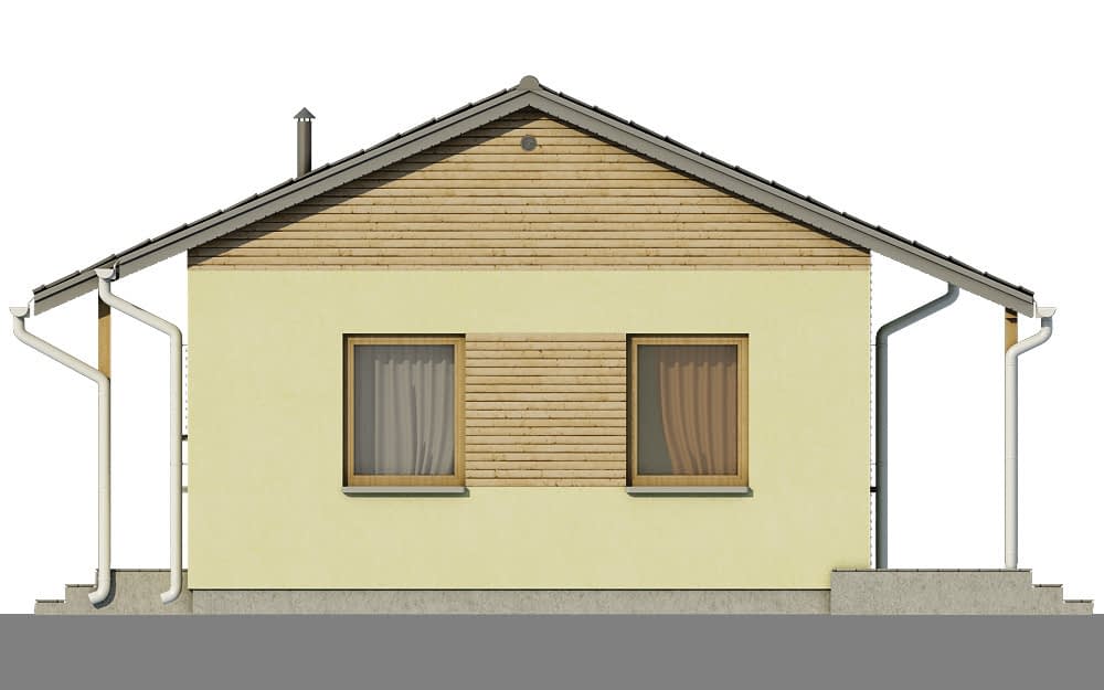 Prezentowany dom jest jednym z najtańszych w budowie i eksploatacji. Przeznaczony jest dla trzy - czteroosobowej rodziny. Może też pełnić funkcję wygodnego domu letniego. Szeroki okap dachu chroni taras przed zbytnim nasłonecznieniem jak również umożliwia korzystanie z niego podczas deszczu. Dom posiada wygodny układ funkcjonalny z podziałem na część dzienną obejmującą kuchnię, i pokój dzienny oraz część nocną z pokojami sypialnymi i łazienką. Możliwe jest oddzielenie kuchni od pokoju dziennego. Od strony sypialni możliwa jest dobudowa garażu lub wiaty na samochód.Konstrukcja