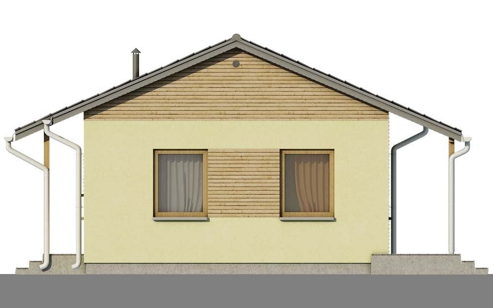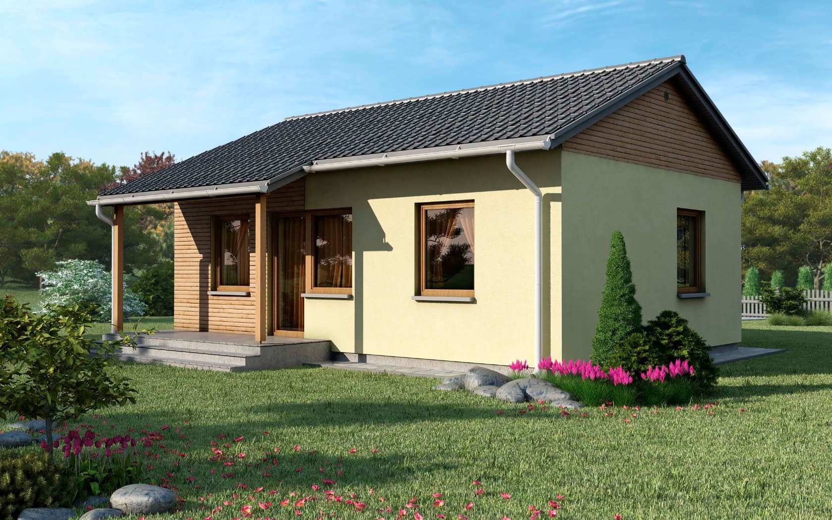 Prezentowany dom jest jednym z najtańszych w budowie i eksploatacji. Przeznaczony jest dla trzy - czteroosobowej rodziny. Może też pełnić funkcję wygodnego domu letniego. Szeroki okap dachu chroni taras przed zbytnim nasłonecznieniem jak również umożliwia korzystanie z niego podczas deszczu. Dom posiada wygodny układ funkcjonalny z podziałem na część dzienną obejmującą kuchnię, i pokój dzienny oraz część nocną z pokojami sypialnymi i łazienką. Możliwe jest oddzielenie kuchni od pokoju dziennego. Od strony sypialni możliwa jest dobudowa garażu lub wiaty na samochód.Konstrukcja