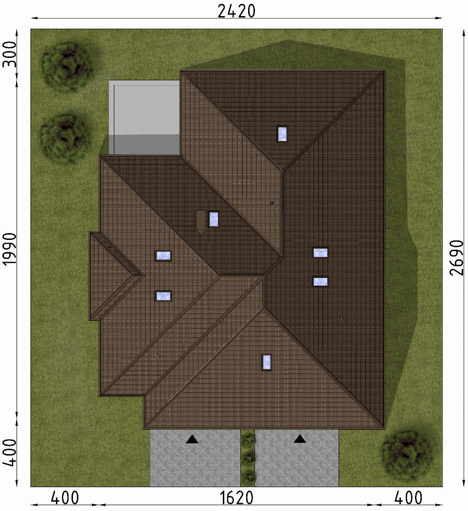 - rzut dachu – wymiary dachu, kąt nachylenia wszystkich połaci dachu, rozmieszczenie okien połaciowych, lukarn, kominów.
