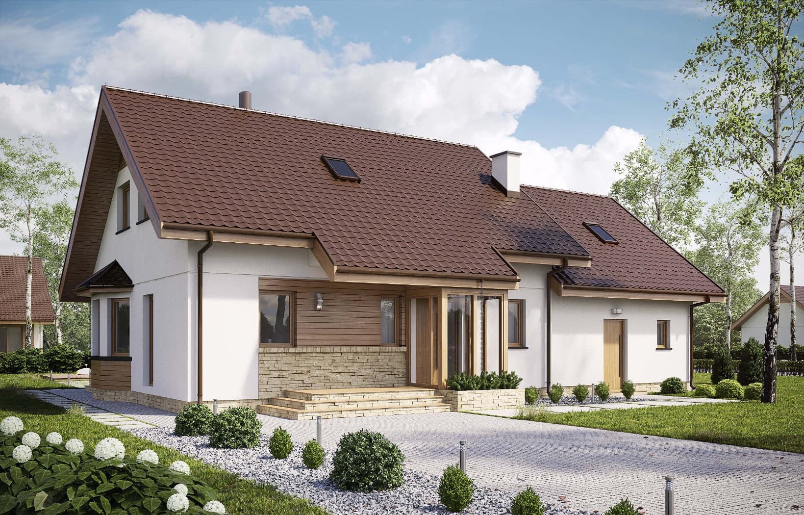 D213 to dom mieszkalny jednorodzinny z poddaszem użytkowym. Idealny dla 4-5-osobowej rodziny. Może również pełnić funkcję domku letniskowego. Prosta bryła budynku oraz nieskomplikowana konstrukcja wpływają na niższe koszty budowy. Bardzo funkcjonalny podział pomieszczeń z oddzielną strefą techniczną, strefą dzienną na parterze i nocną na poddaszu. Nad garażem zostało wydzielony strych.Konstrukcja