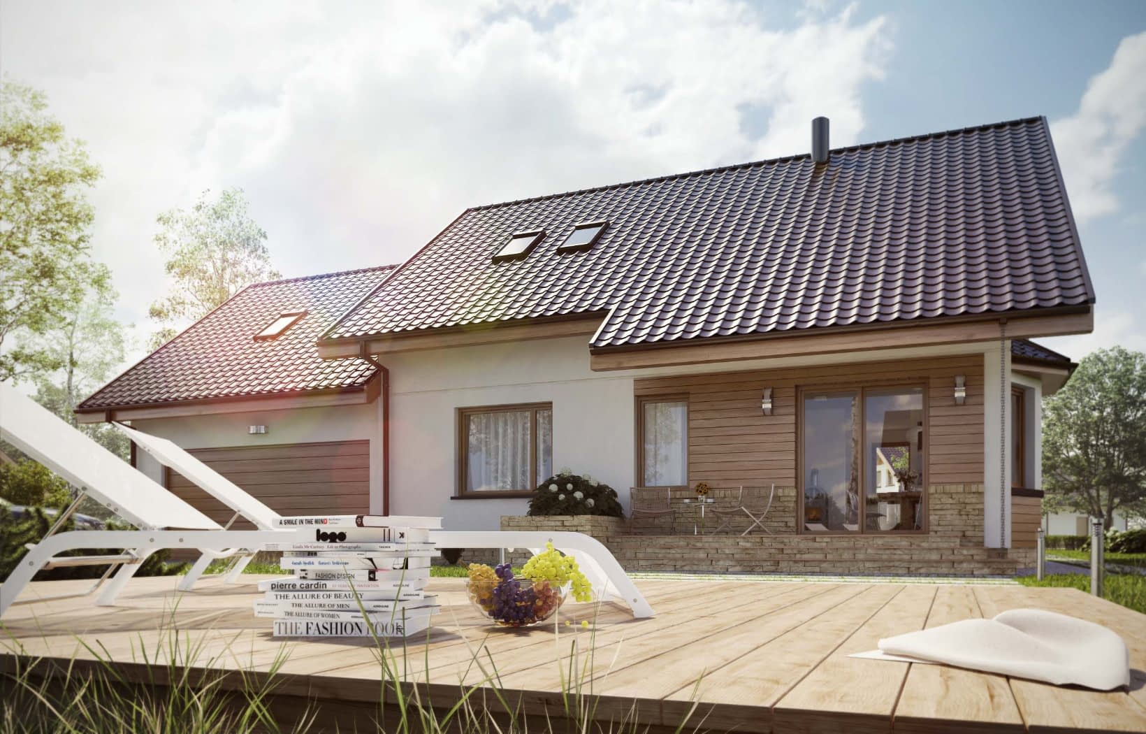 - elewacje (frontowa, dwie elewacje boczne, ogrodowa) – dokładny wygląd domu z każdej strony.