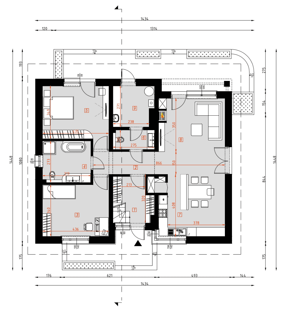 - rzuty wszystkich kondygnacji (np. parter, piwnica, piętro) – rozmieszczenie i wymiary wszystkich pomieszczeń, rozmieszczenie i wielkość otworów okiennych i drzwiowych, rozmieszczenie kominów, sugerowana aranżacja wnętrz.