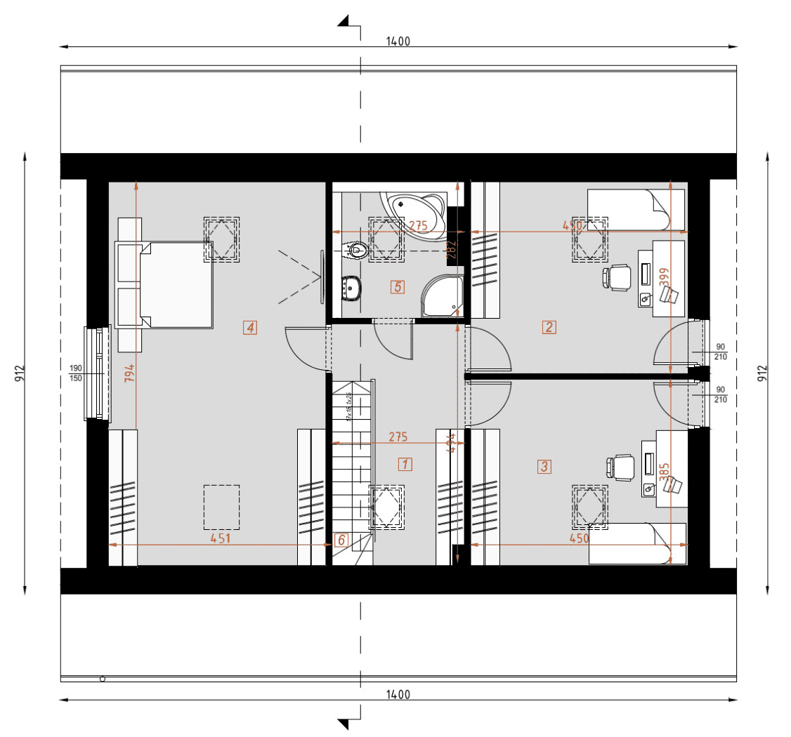 - rzut dachu – wymiary dachu, kąt nachylenia wszystkich połaci dachu, rozmieszczenie okien połaciowych, lukarn, kominów.