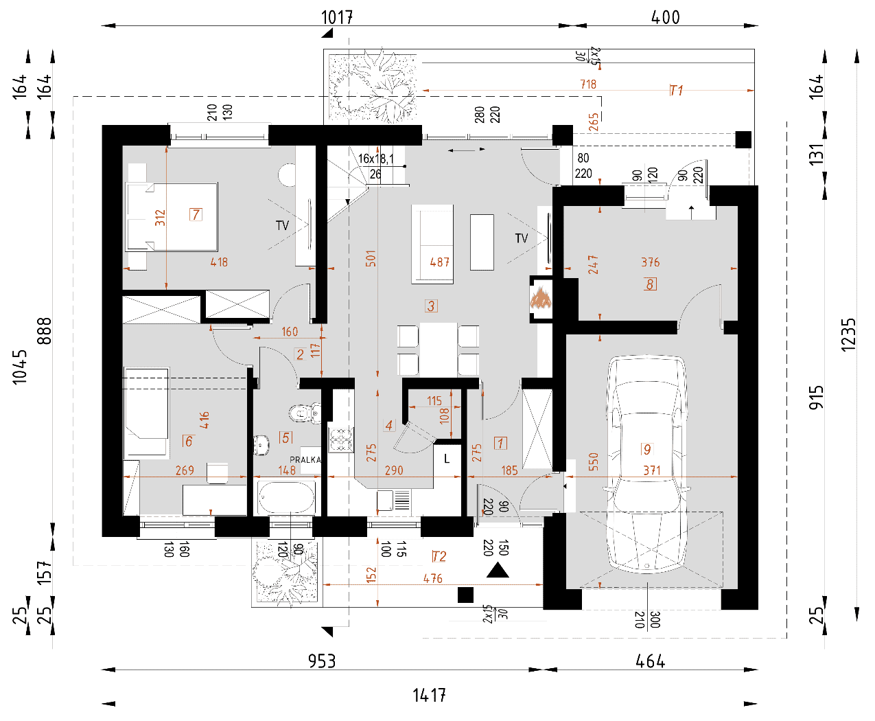 Dom mieszkalny jednorodzinny parterowy z poddaszem użytkowym. Idealny dla 3-5-osobowej rodziny. Prosta bryła budynku oraz nieskomplikowana konstrukcja wpływają na niższe koszty budowy. Bardzo funkcjonalny podział pomieszczeń z oddzielną strefą techniczną, strefą dzienną i nocną. Atutem tego projektu jest również nowoczesny wygląd elewacji.Konstrukcja
