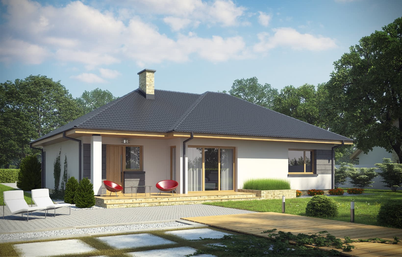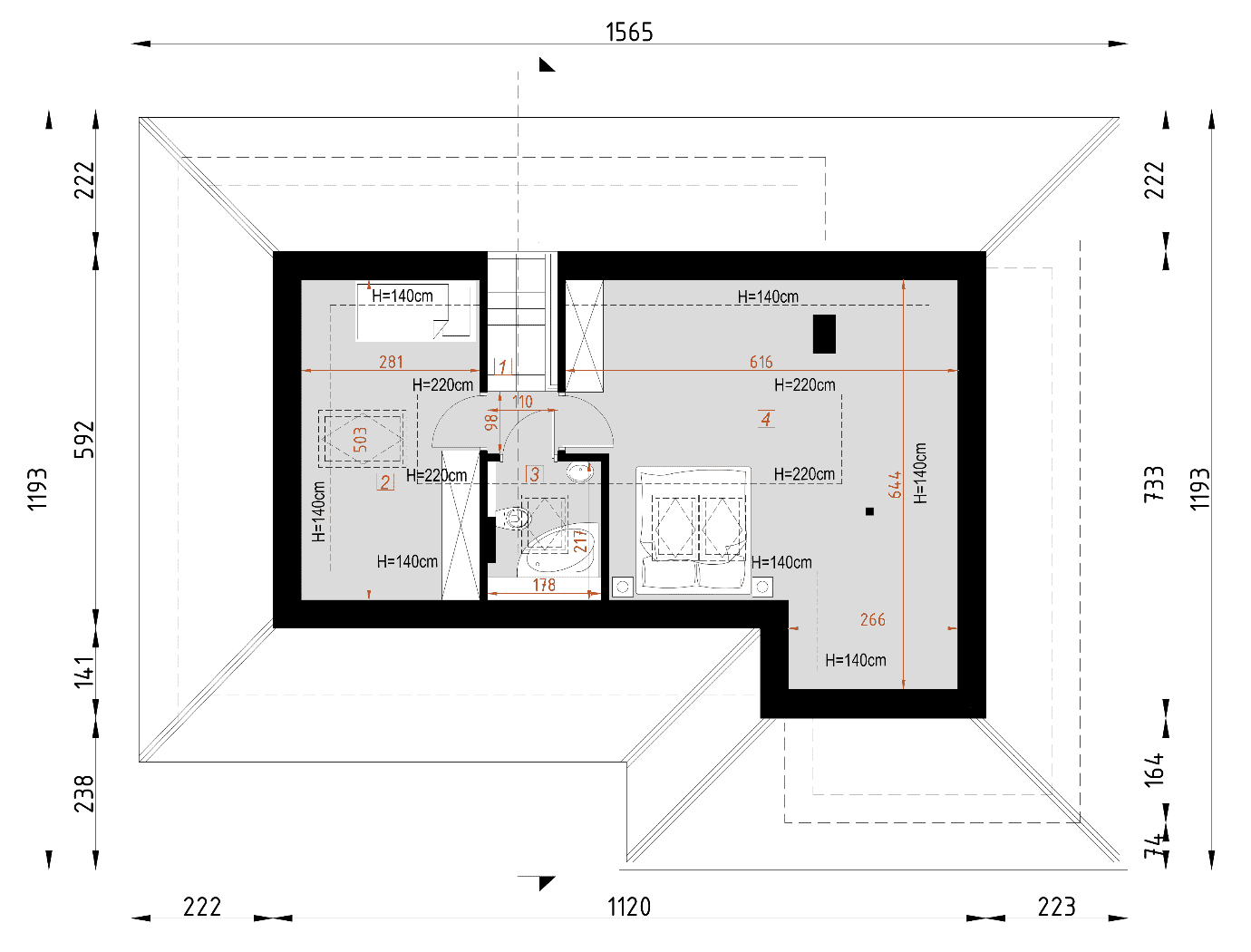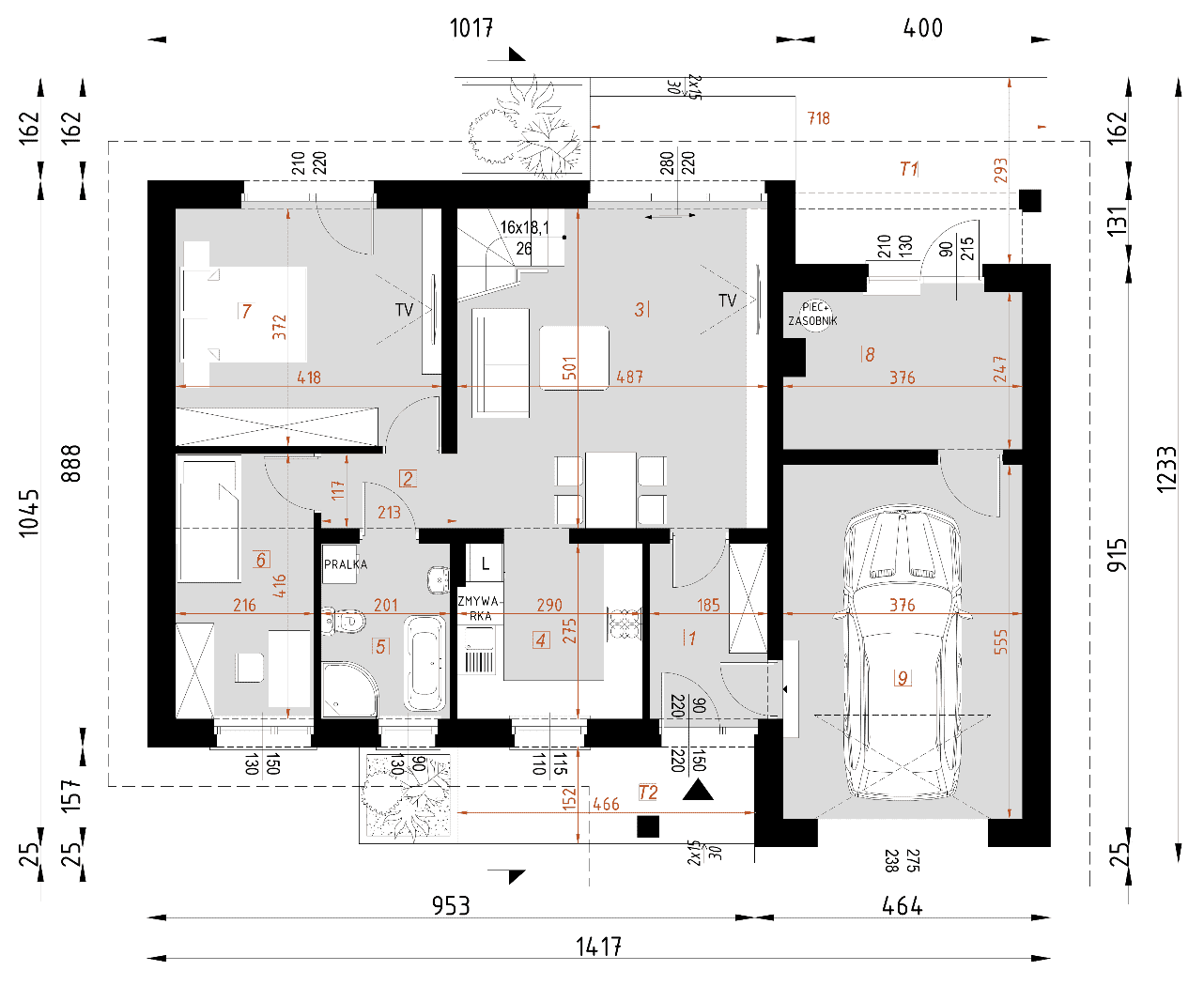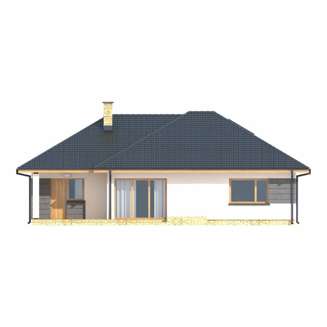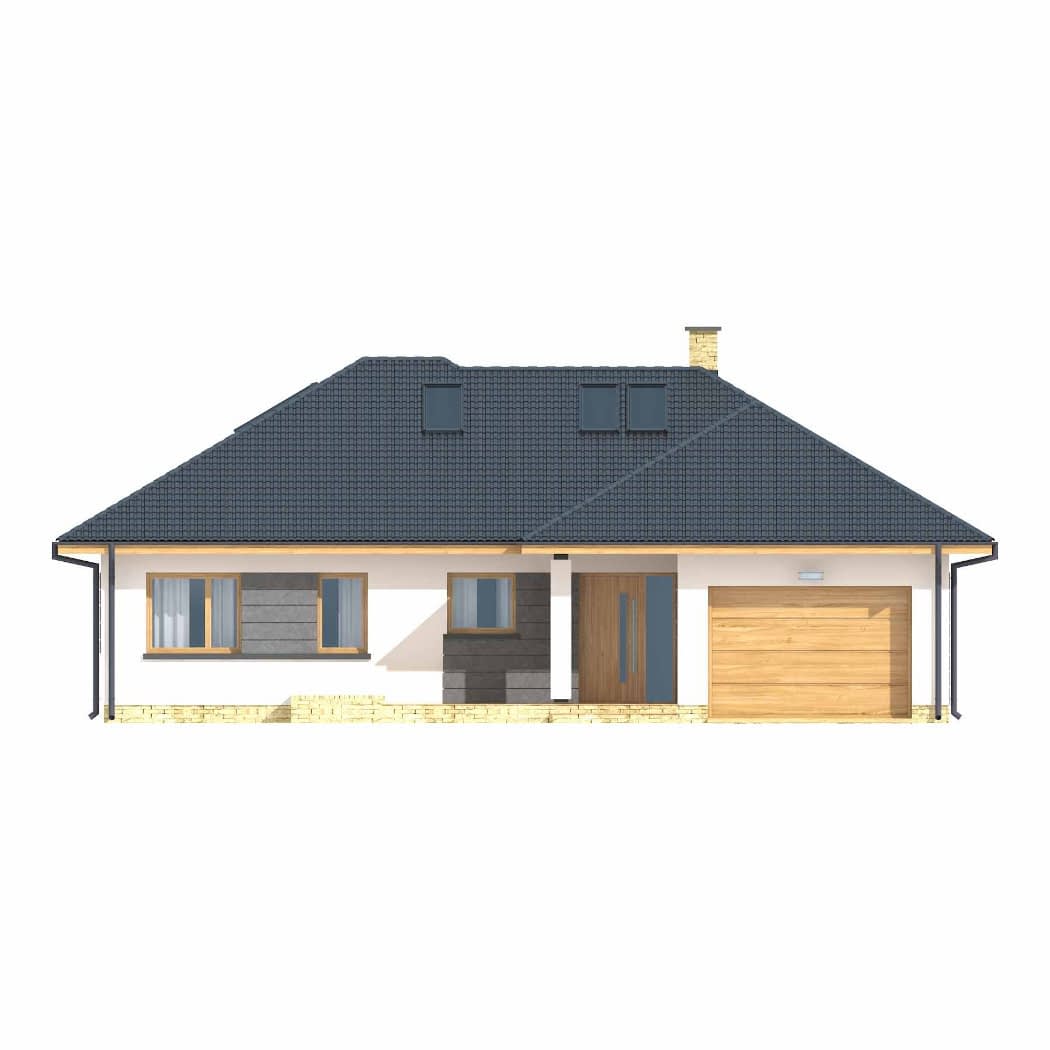 Dom mieszkalny jednorodzinny parterowy z poddaszem użytkowym. Idealny dla 3-5-osobowej rodziny. Prosta bryła budynku oraz nieskomplikowana konstrukcja wpływają na niższe koszty budowy. Bardzo funkcjonalny podział pomieszczeń z oddzielną strefą techniczną, strefą dzienną i nocną. Atutem tego projektu jest również nowoczesny wygląd elewacji.Konstrukcja