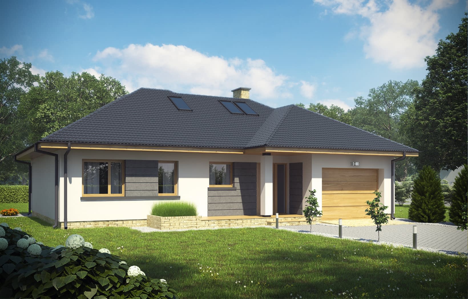 - elewacje (frontowa, dwie elewacje boczne, ogrodowa) – dokładny wygląd domu z każdej strony.