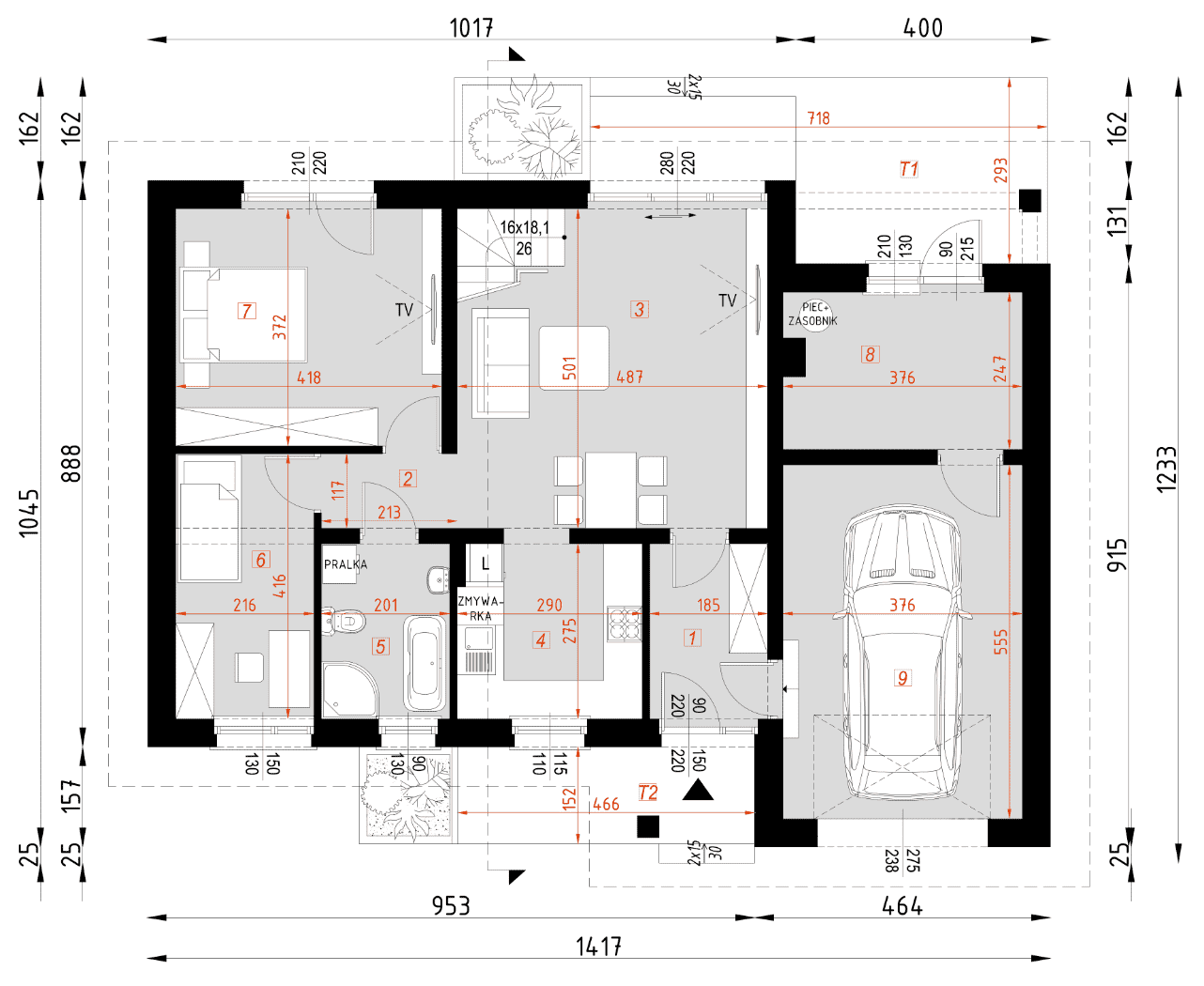 - Minimalne wymiary działki18.45 x 20.17m