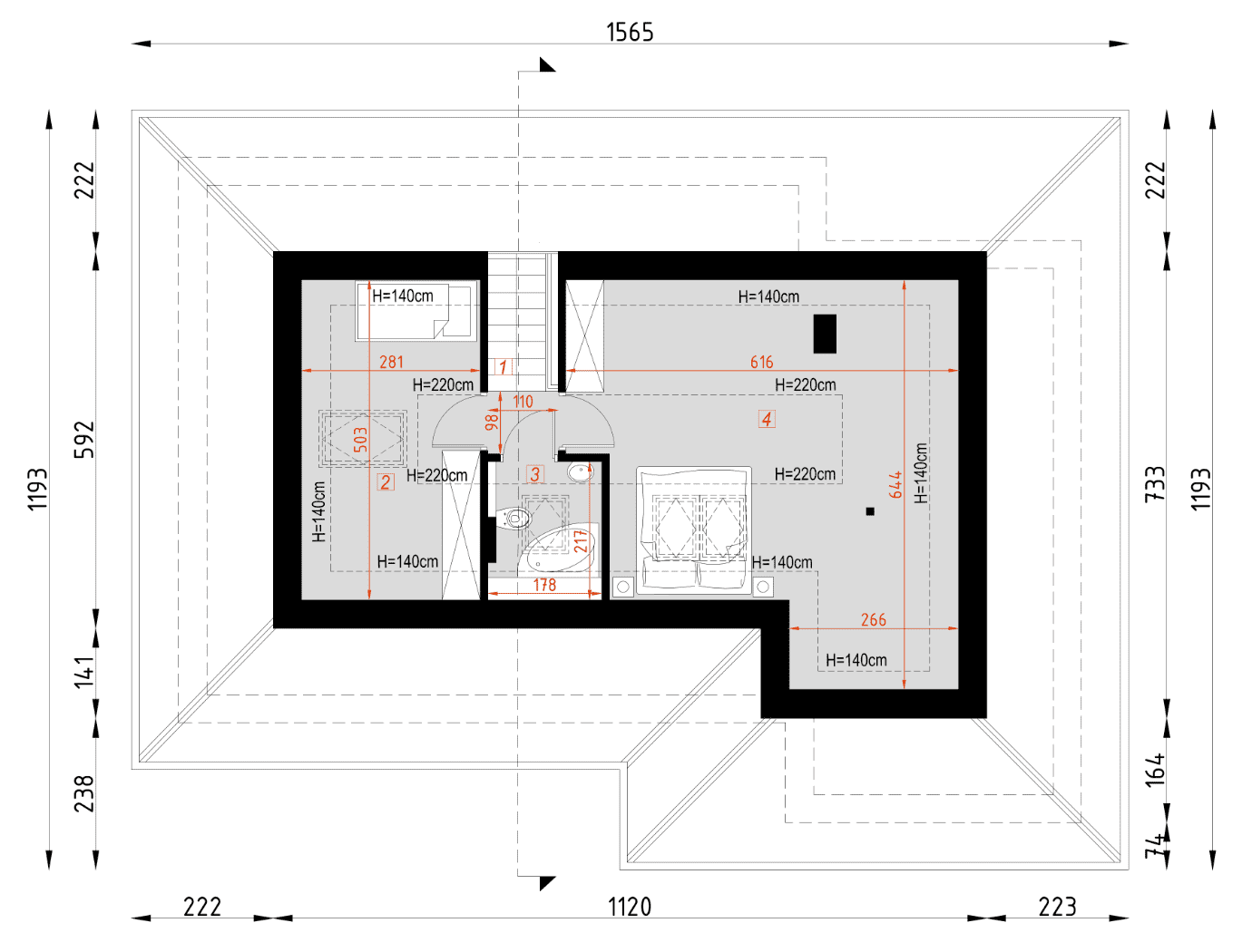 - rzut dachu – wymiary dachu, kąt nachylenia wszystkich połaci dachu, rozmieszczenie okien połaciowych, lukarn, kominów.