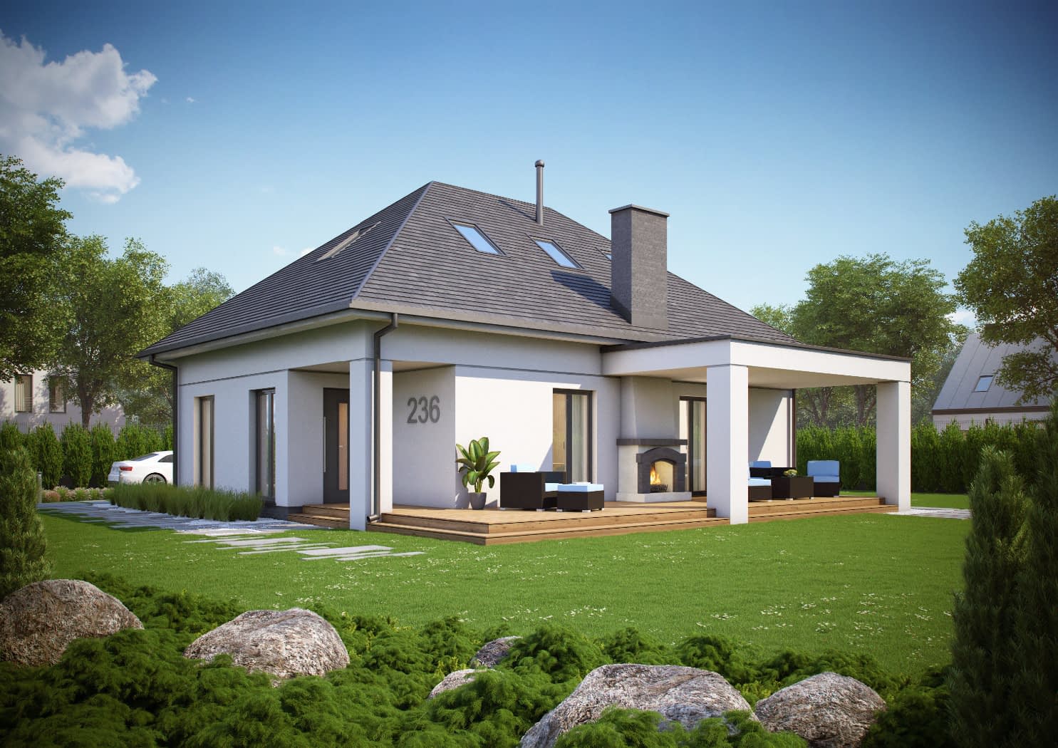 - elewacje (frontowa, dwie elewacje boczne, ogrodowa) – dokładny wygląd domu z każdej strony.