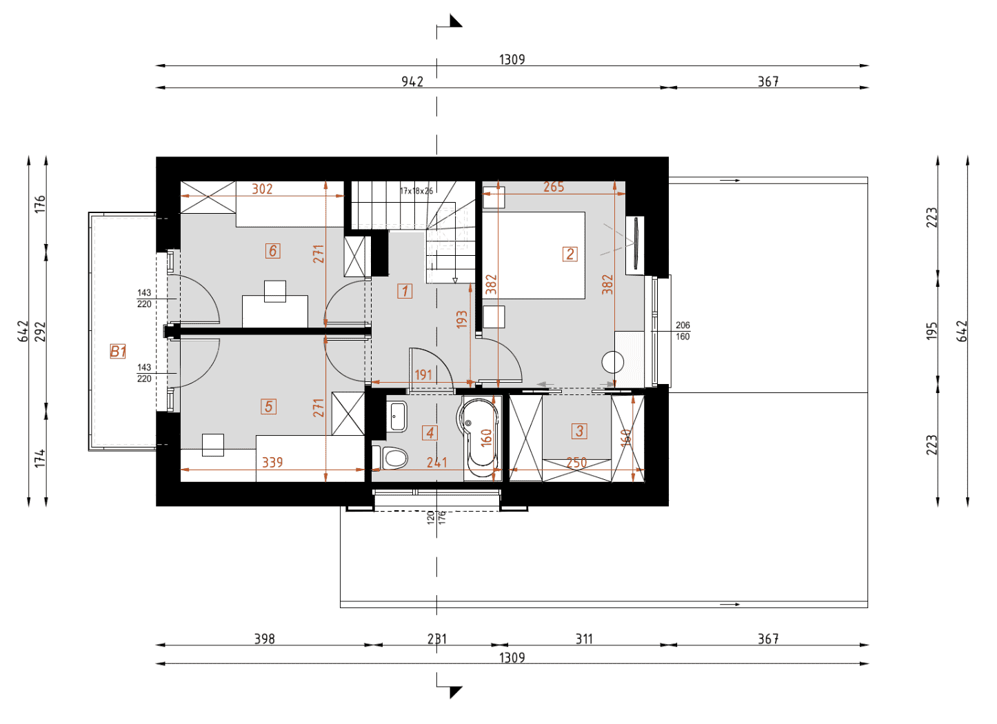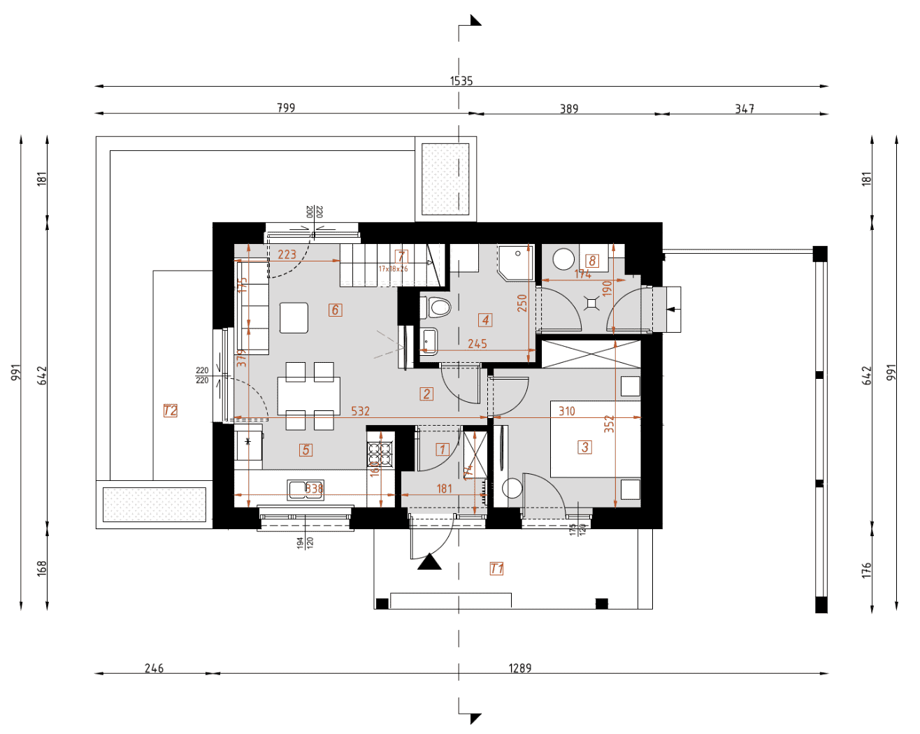 - rzuty wszystkich kondygnacji (np. parter, piwnica, piętro) – rozmieszczenie i wymiary wszystkich pomieszczeń, rozmieszczenie i wielkość otworów okiennych i drzwiowych, rozmieszczenie kominów, sugerowana aranżacja wnętrz.