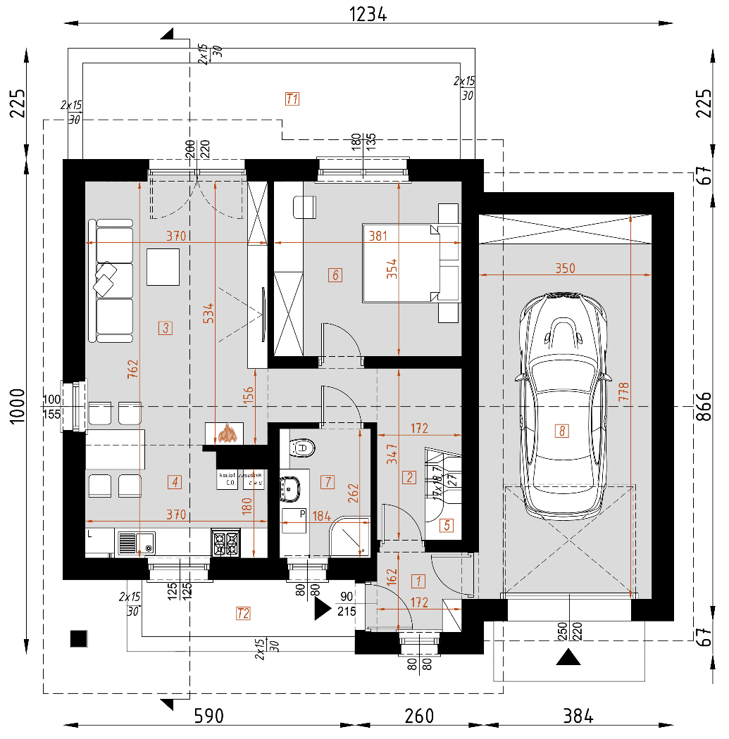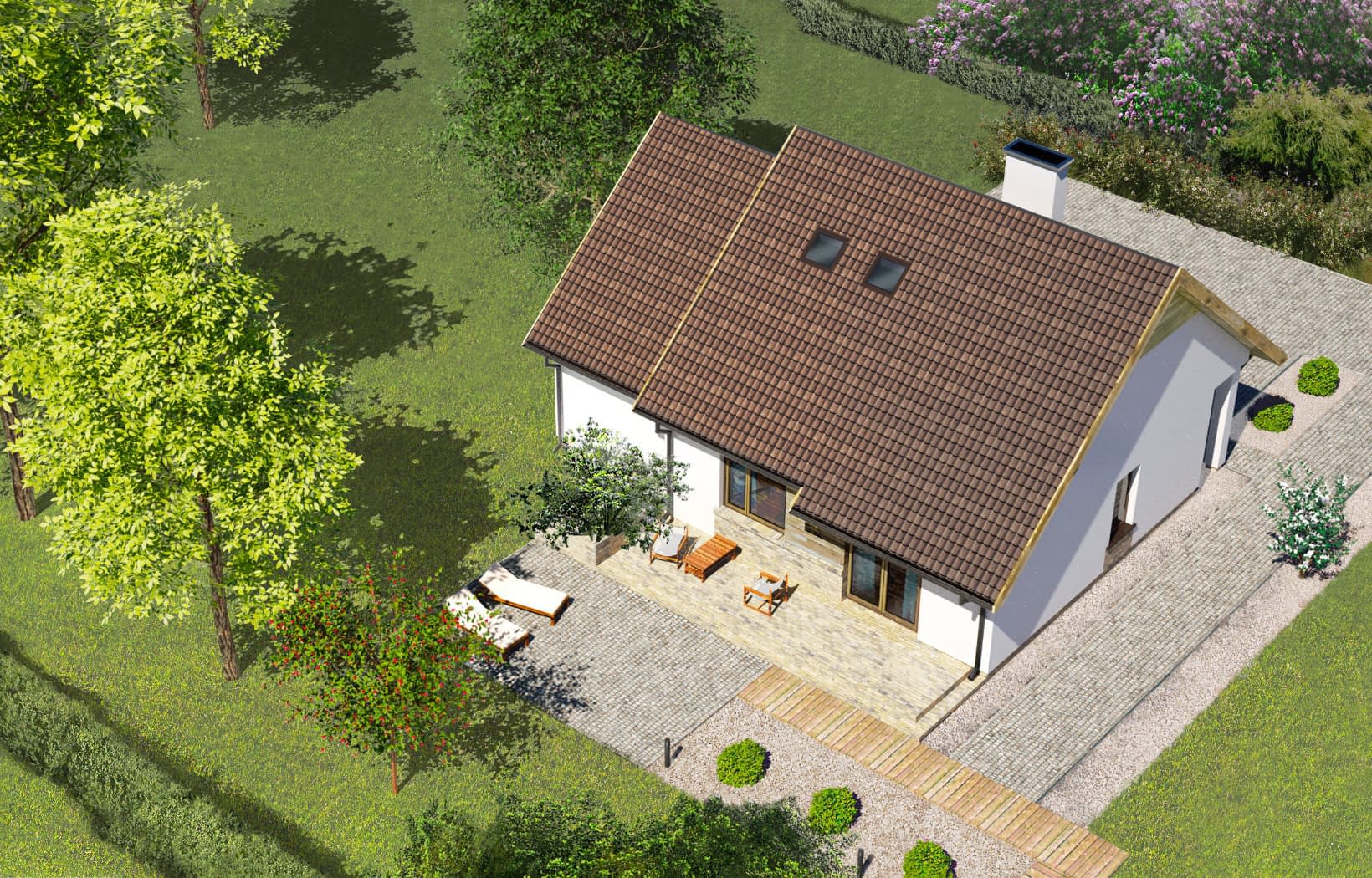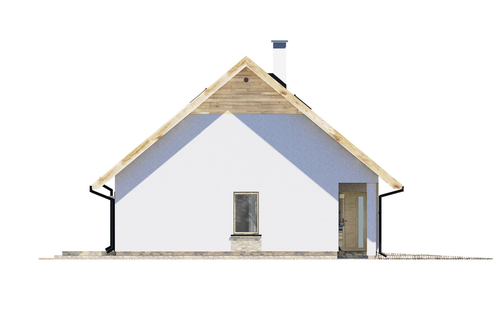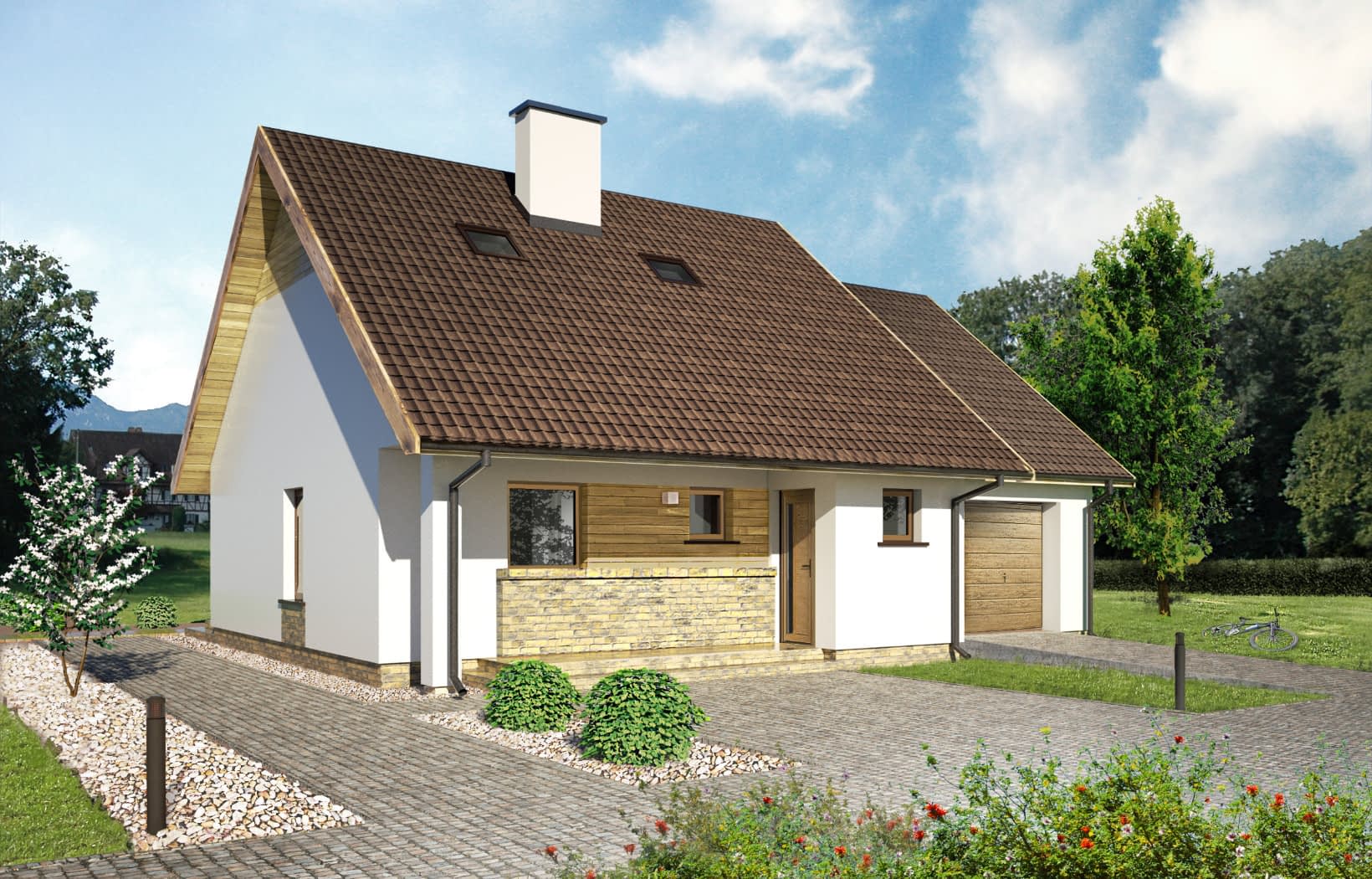 Nieduży dom parterowy z poddaszem do adaptacji w formie antresoli. Swietnie sprawdzi się jako propozycja domu dla dwojga lub też jako dom letniskowy.Konstrukcja
