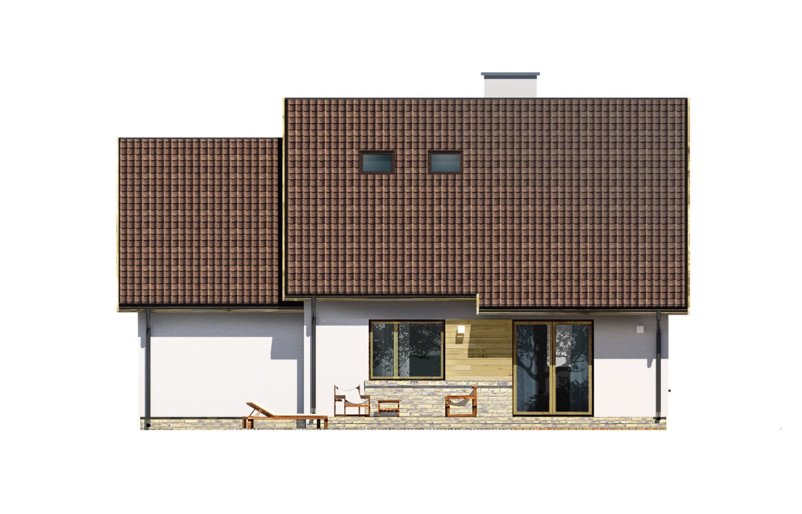 Dach: blachodachówkaElewacje: tynk mineralny na siatce, na fragmentach deski i płyty kamienne