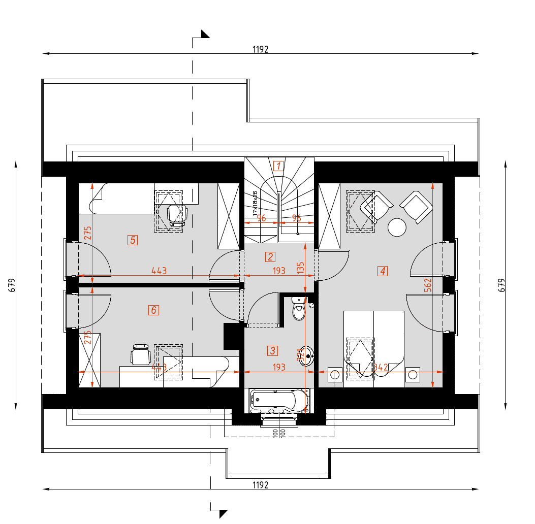 - rzuty wszystkich kondygnacji (np. parter, piwnica, piętro) – rozmieszczenie i wymiary wszystkich pomieszczeń, rozmieszczenie i wielkość otworów okiennych i drzwiowych, rozmieszczenie kominów, sugerowana aranżacja wnętrz.