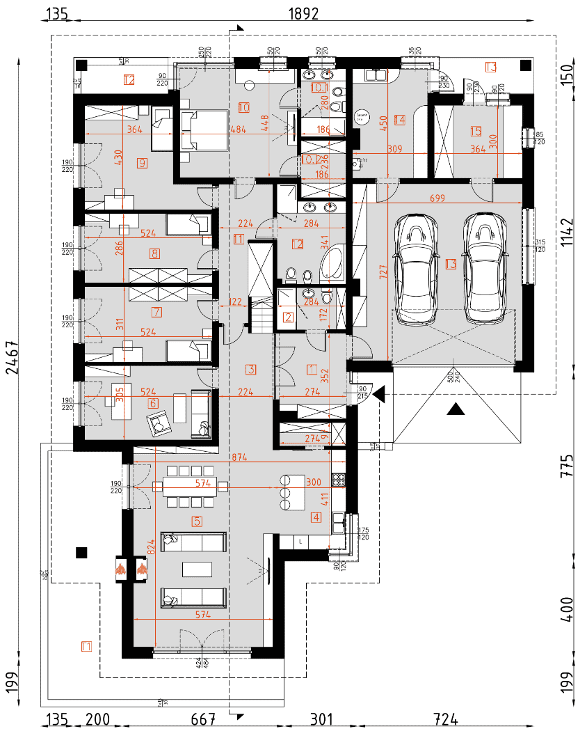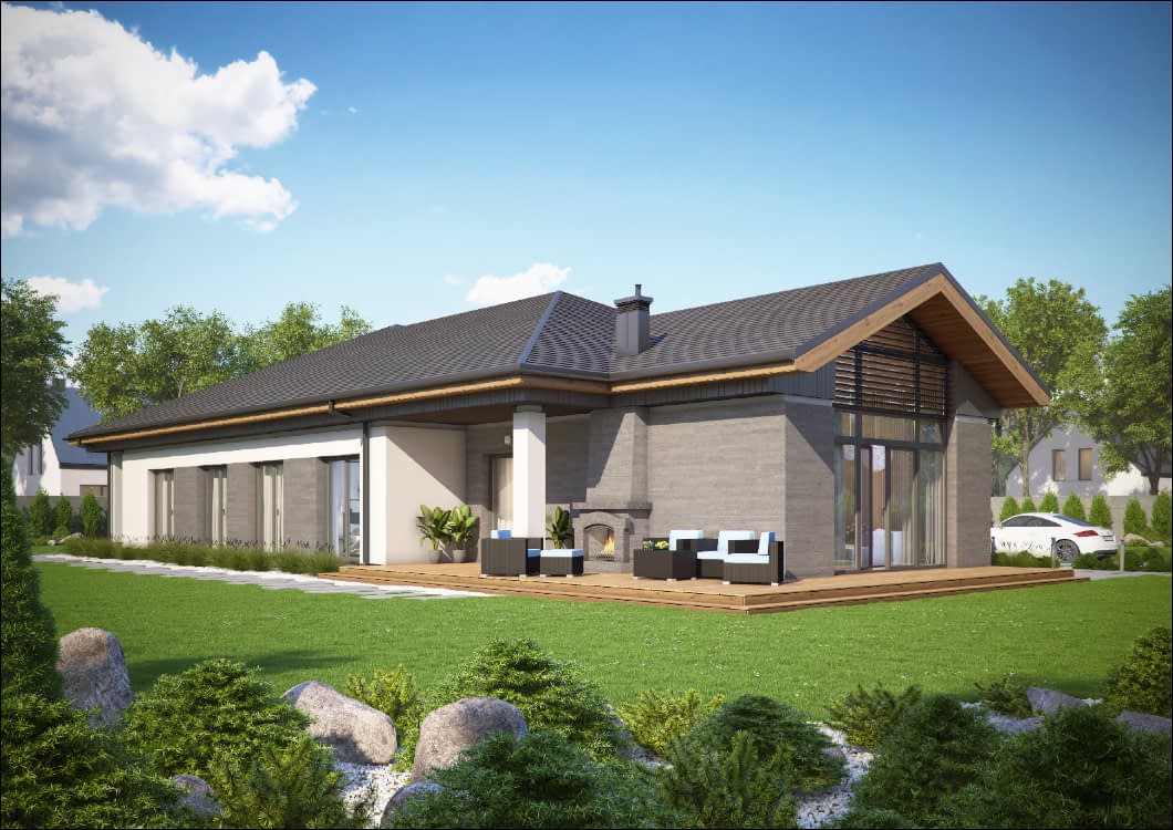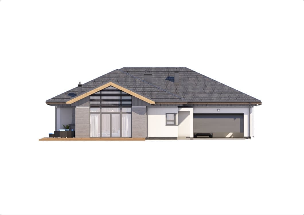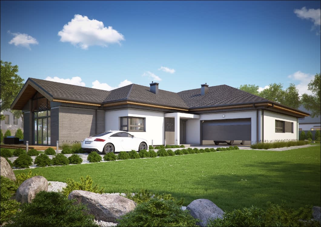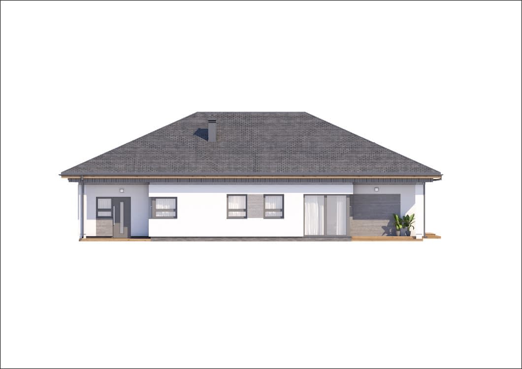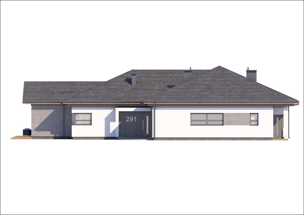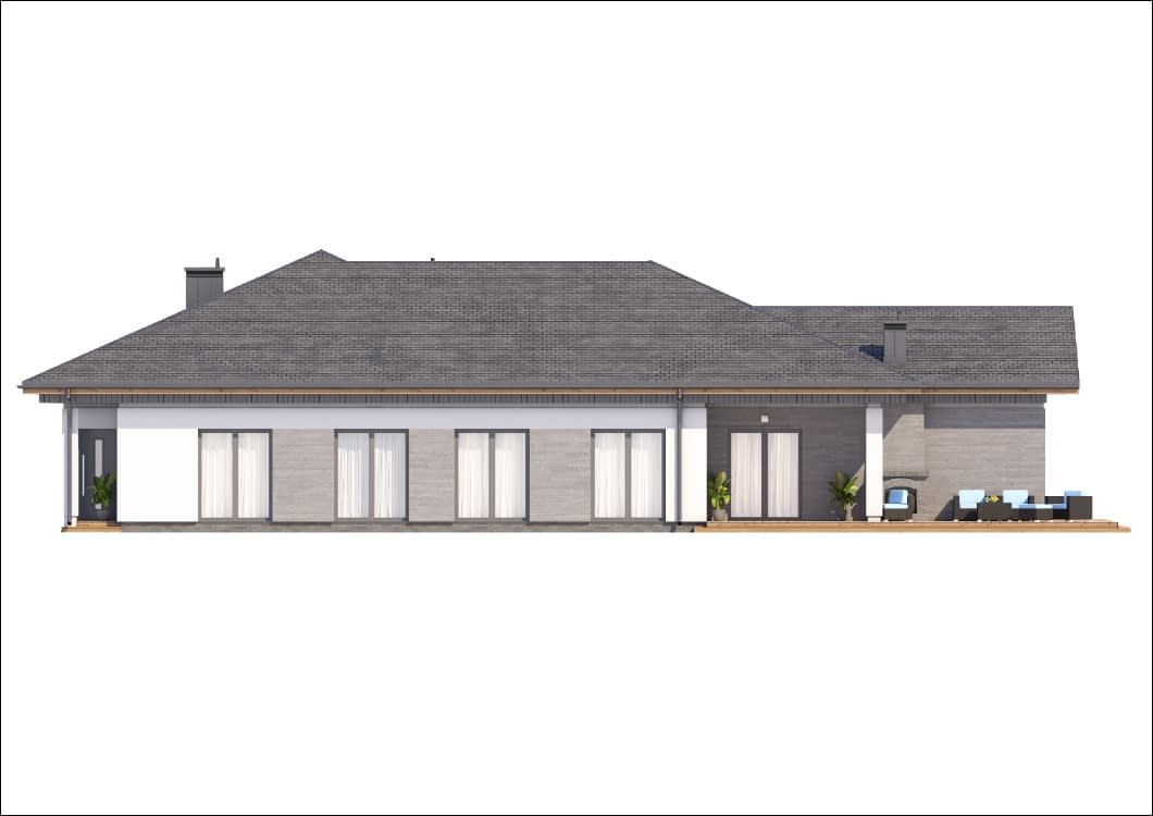Nowoczesny, duży dom parterowy. Projekt domu oferuje pięć pokoi sypialnianych, przestronny pokój dzienny połączony z kuchnią. Aż 3 łazienki, garderobę i spiżarnię.Konstrukcja