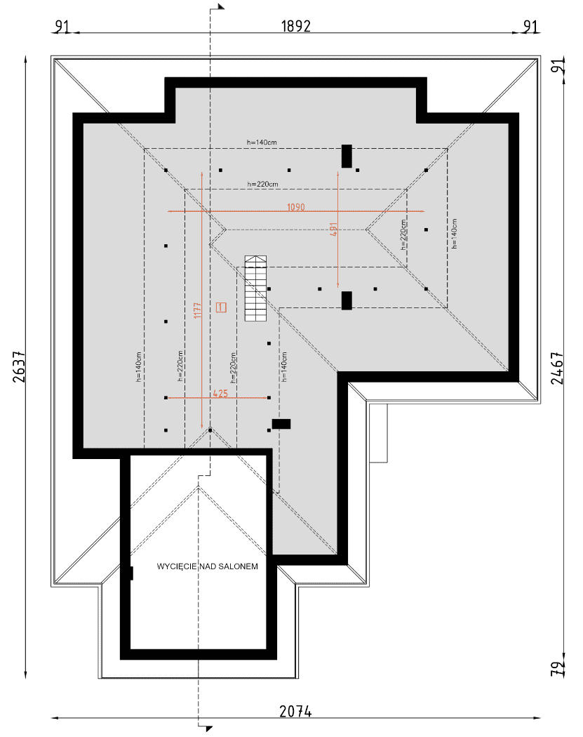 - rzut dachu – wymiary dachu, kąt nachylenia wszystkich połaci dachu, rozmieszczenie okien połaciowych, lukarn, kominów.