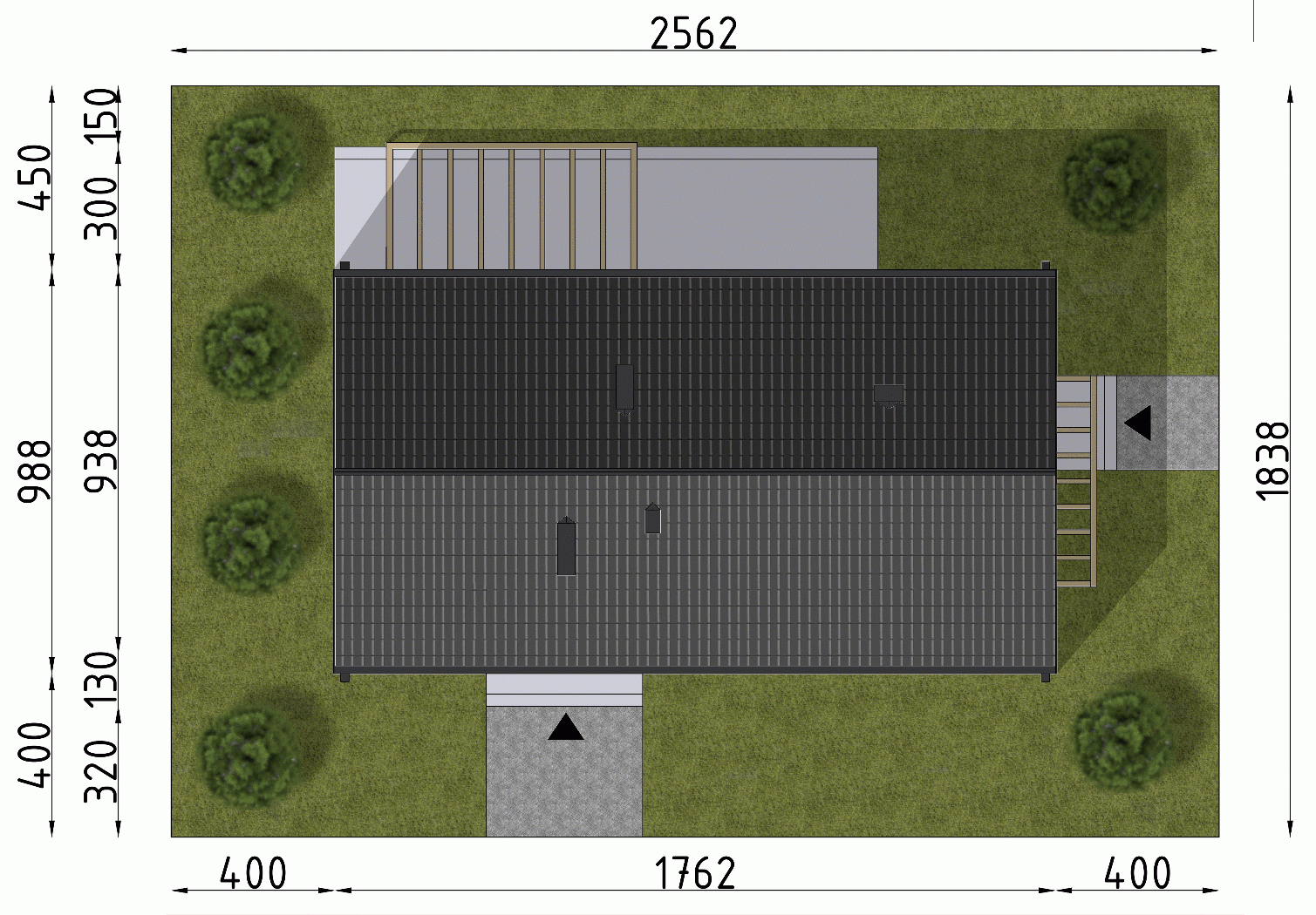 - elewacje (frontowa, dwie elewacje boczne, ogrodowa) – dokładny wygląd domu z każdej strony.