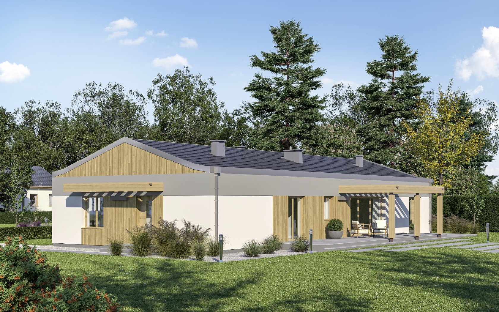 Elewacja: tynk cienkowarstwowy, drewno lub panele drewnopodobne