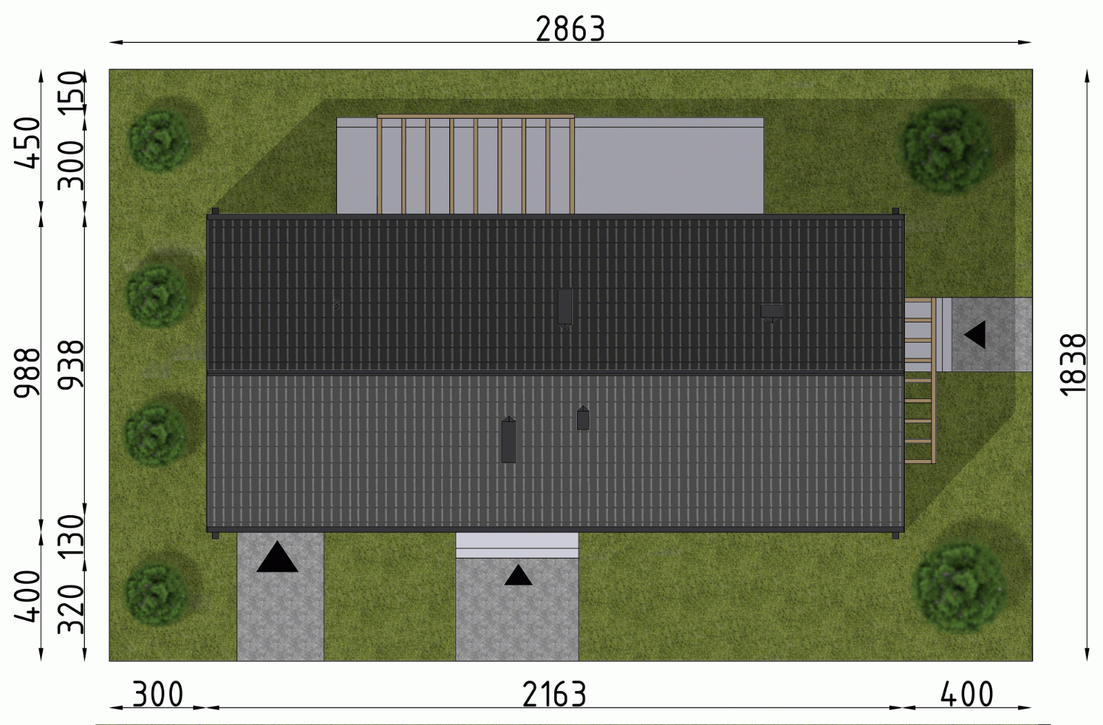 - elewacje (frontowa, dwie elewacje boczne, ogrodowa) – dokładny wygląd domu z każdej strony.